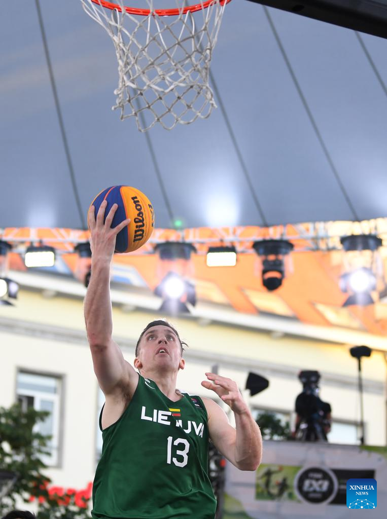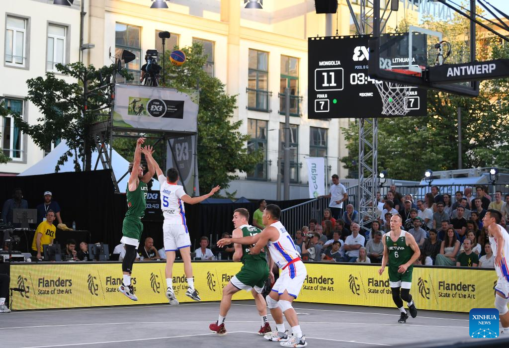 Players compete during the FIBA 3X3 World Cup men's pool round match between Lithuania and Mongolia in Antwerp, Belgium, June 22, 2022 (Xinhua/Ren Pengfei)