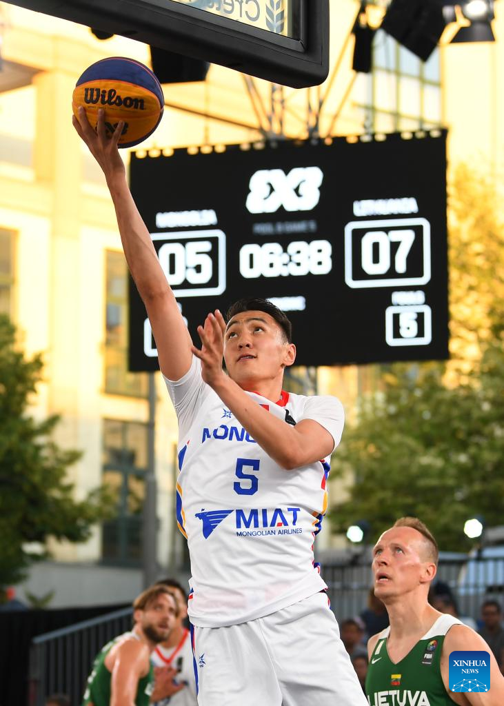 Anand Ariunbold of Mongolia lays the ball up during the FIBA 3X3 World Cup men's pool round match between Lithuania and Mongolia in Antwerp, Belgium, June 22, 2022 (Xinhua/Ren Pengfei)