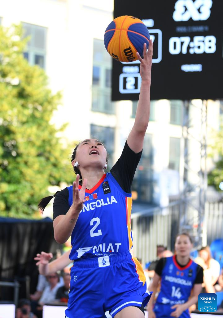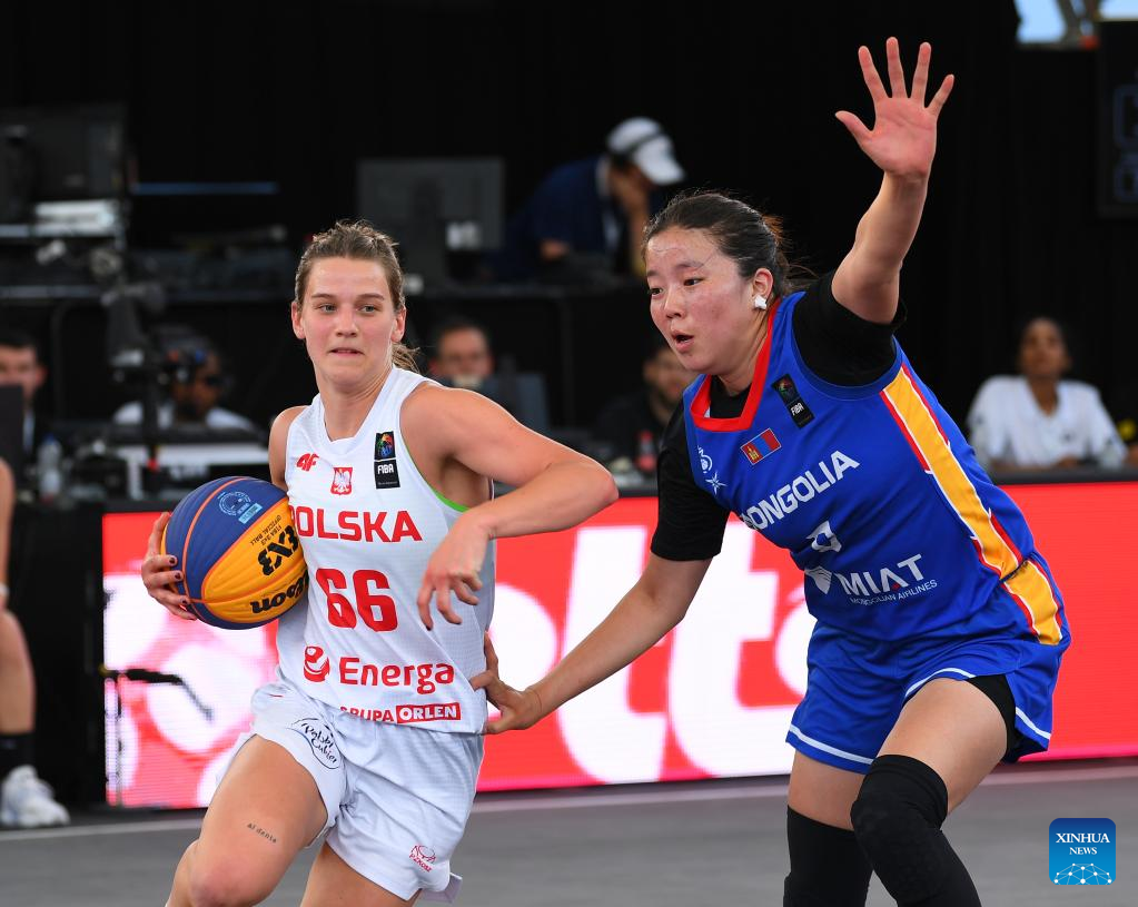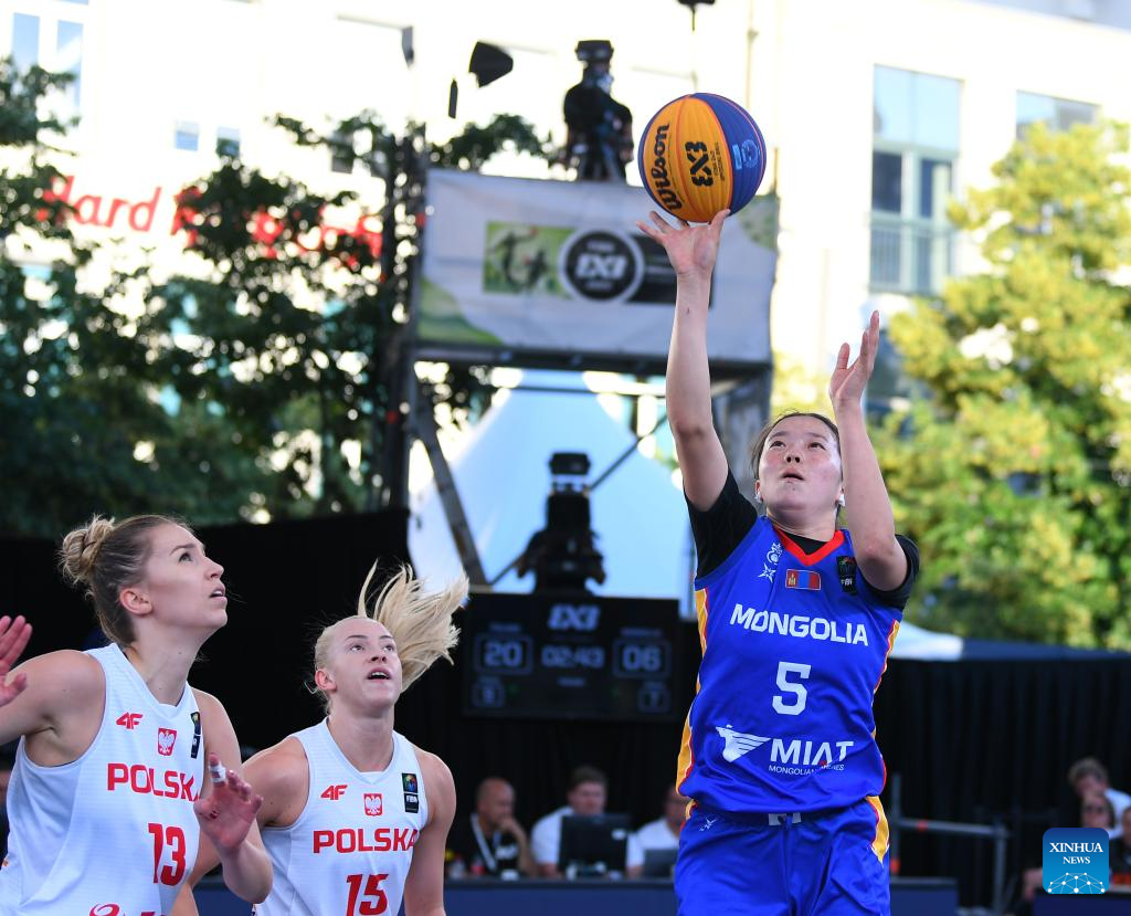 Ariuntsetseg Bat-erdene (R) of Mongolia shoots during the FIBA 3X3 World Cup women's pool round match between Poland and Mongolia in Antwerp, Belgium, June 22, 2022. (Xinhua/Ren Pengfei)