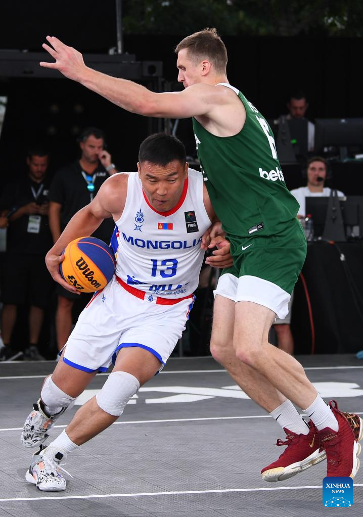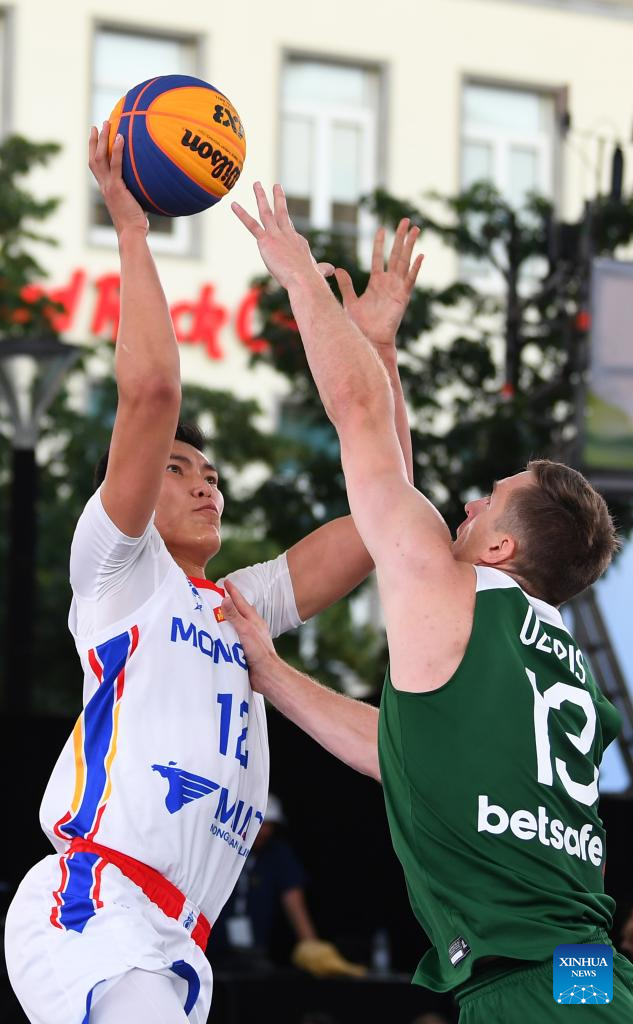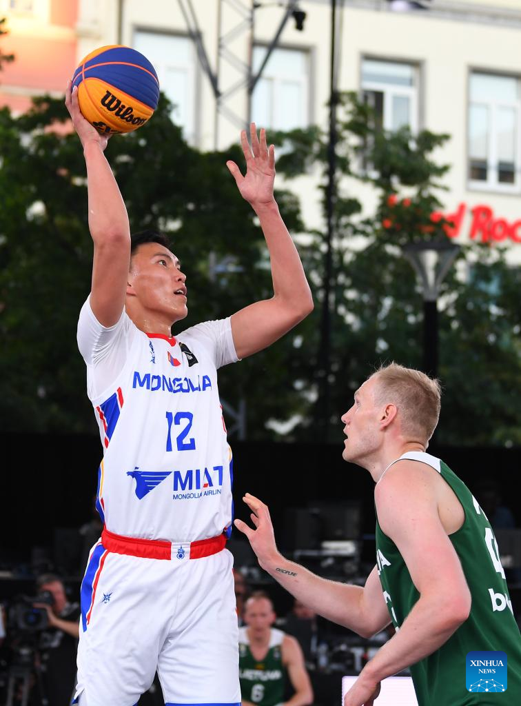 Enkhbaatar Onolbaatar (L) of Mongolia shoots during the FIBA 3X3 World Cup men's pool round match between Lithuania and Mongolia in Antwerp, Belgium, June 22, 2022 (Xinhua/Ren Pengfei)