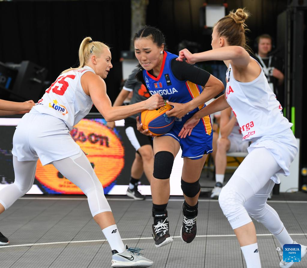 Tserenlkham Munkhsaikhan (M) of Mongolia dribbles the ball during the FIBA 3X3 World Cup women's pool round match between Poland and Mongolia in Antwerp, Belgium, June 22, 2022. (Xinhua/Ren Pengfei)