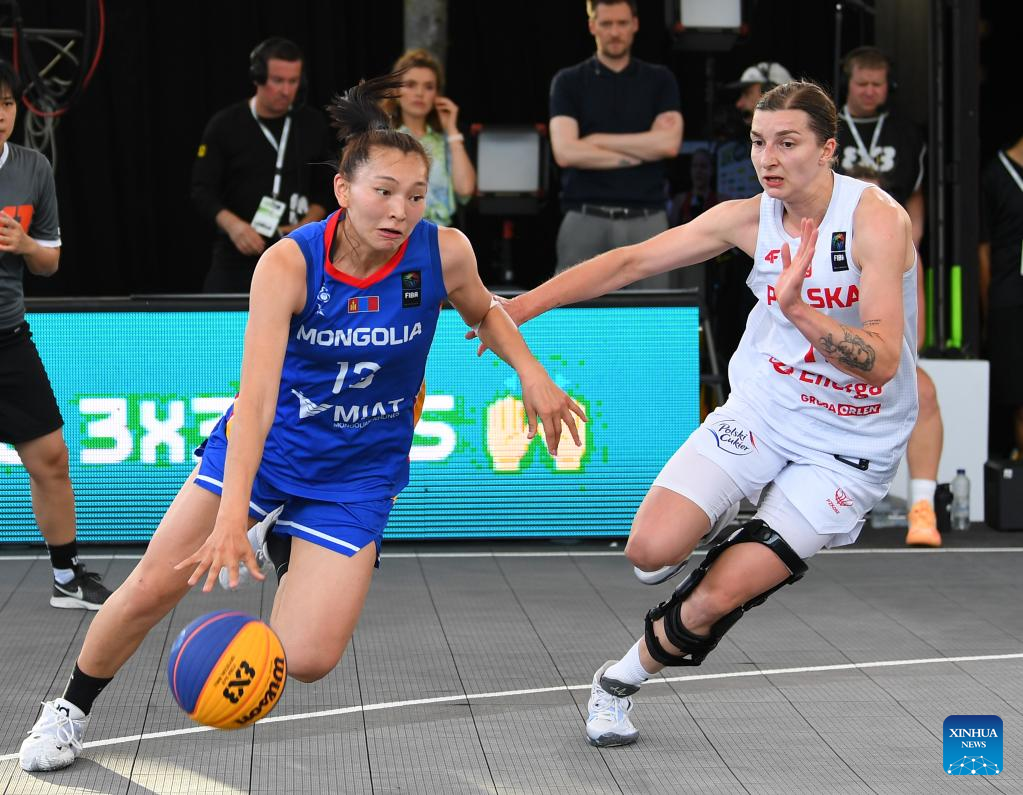 Khulan Onolbaatar (L) of Mongolia dribbles the ball during the FIBA 3X3 World Cup women's pool round match between Poland and Mongolia in Antwerp, Belgium, June 22, 2022. (Xinhua/Ren Pengfei)