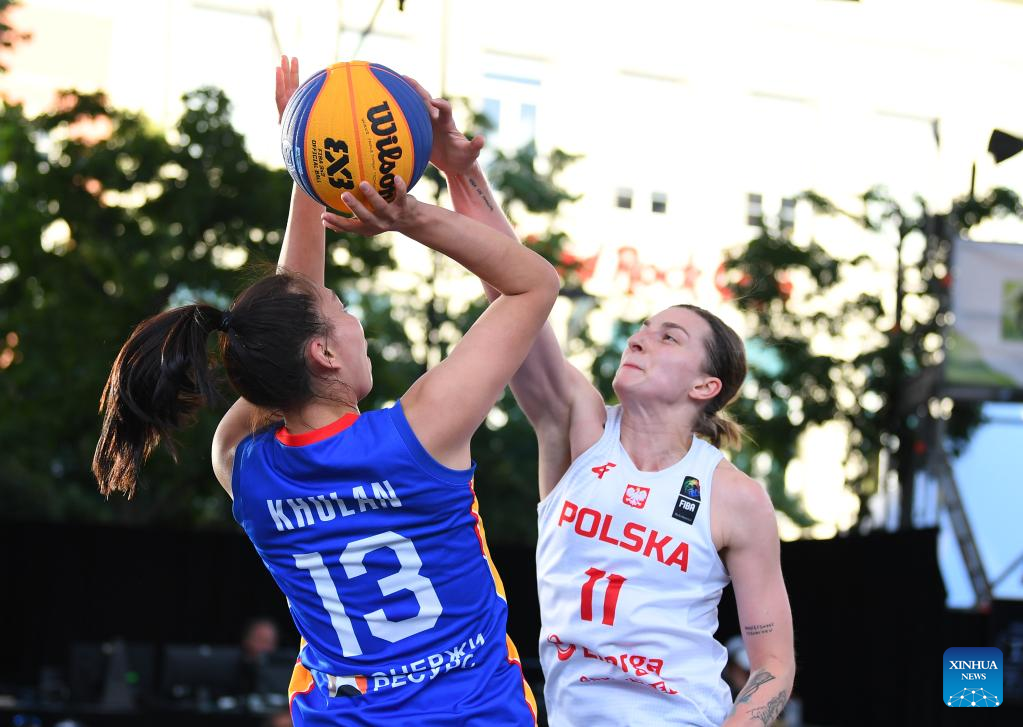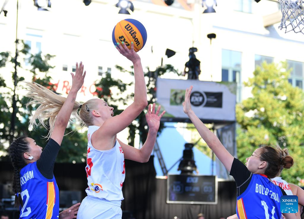 Klaudia Gertchen (M) of Poland shoots during the FIBA 3X3 World Cup women's pool round match between Poland and Mongolia in Antwerp, Belgium, June 22, 2022. (Xinhua/Ren Pengfei)