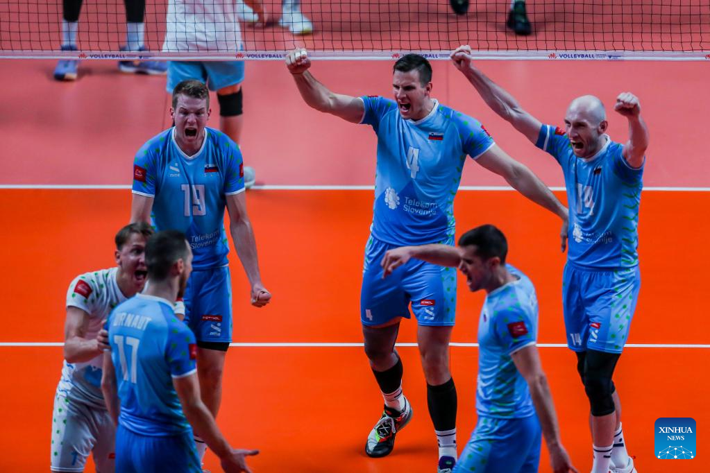 Players of Slovenia celebrate after scoring during the FIVB Volleyball Nations League Men's Pool 3 match between Slovenia and Argentina in Quezon City, the Philippines on June 23, 2022. (Xinhua/Rouelle Umali)