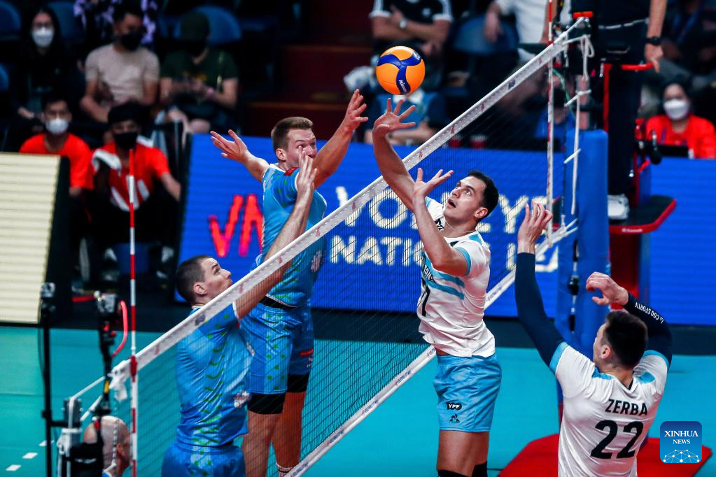 Argentina's Matias Giraudo (2nd R) competes during the FIVB Volleyball Nations League Men's Pool 3 match between Slovenia and Argentina in Quezon City, the Philippines on June 23, 2022. (Xinhua/Rouelle Umali)