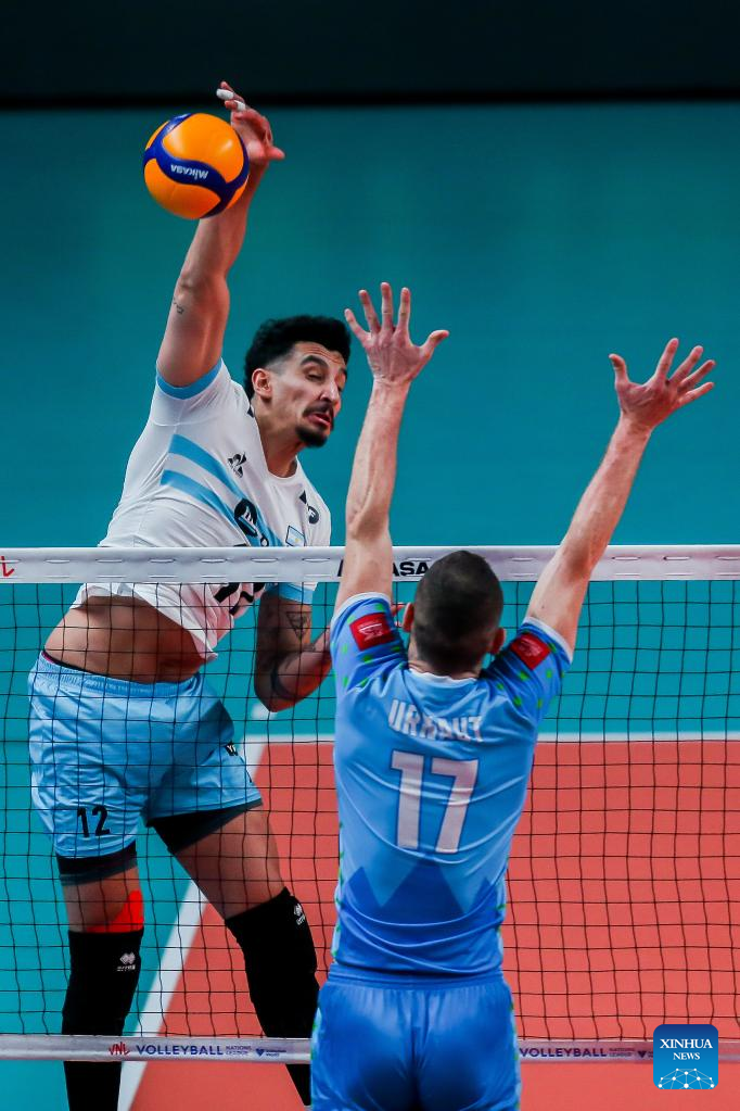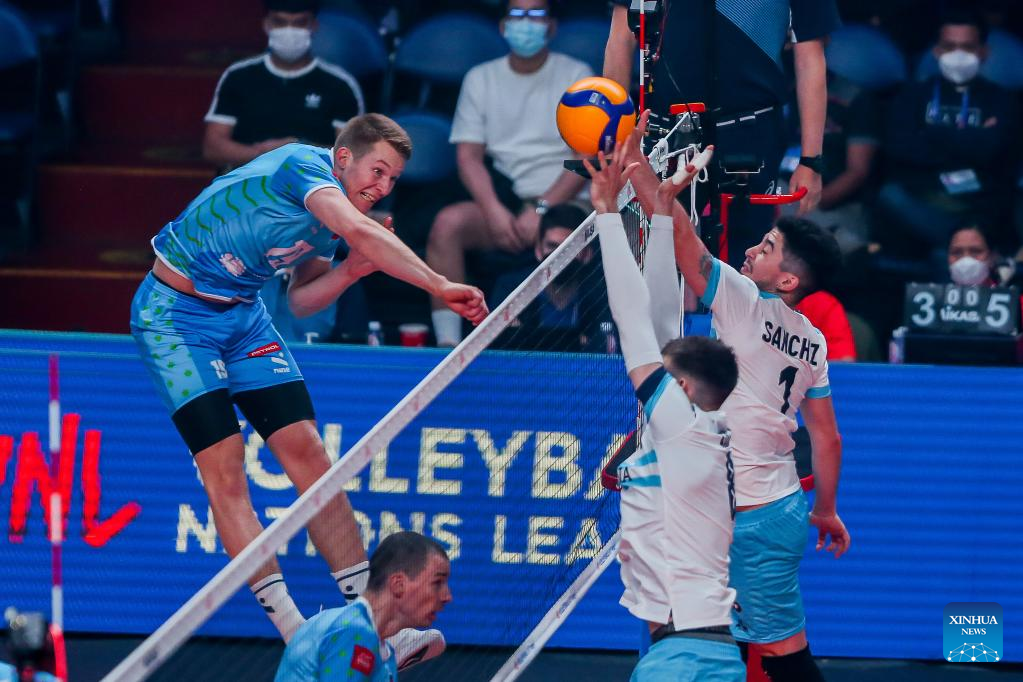 Argentina's Bruno Lima (L) spikes the ball during the FIVB Volleyball Nations League Men's Pool 3 match between Slovenia and Argentina in Quezon City, the Philippines on June 23, 2022. (Xinhua/Rouelle Umali)