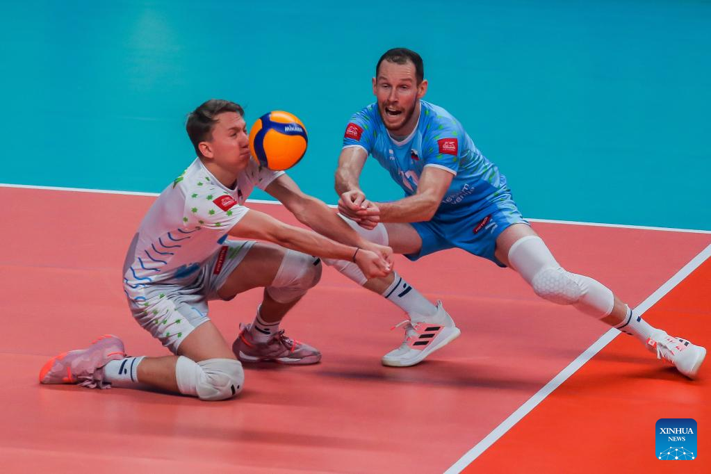 Slovenia's Rok Mozic (L) spikes the ball during the FIVB Volleyball Nations League Men's Pool 3 match between Slovenia and Argentina in Quezon City, the Philippines on June 23, 2022. (Xinhua/Rouelle Umali)