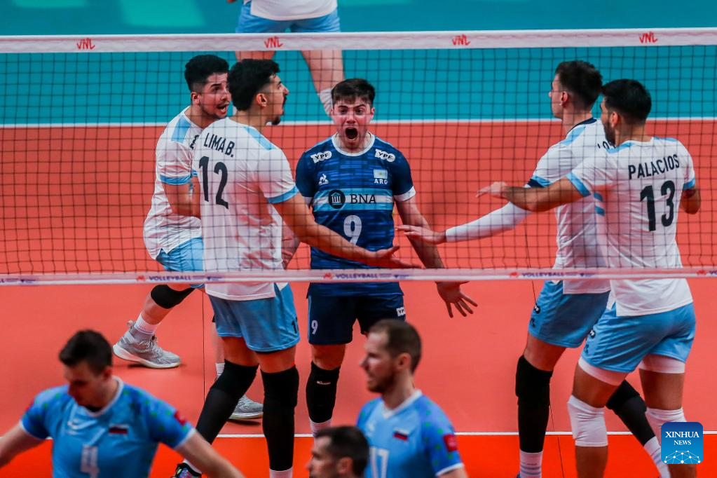 Players of Argentina celebrate after scoring during the FIVB Volleyball Nations League Men's Pool 3 match between Slovenia and Argentina in Quezon City, the Philippines on June 23, 2022. (Xinhua/Rouelle Umali)