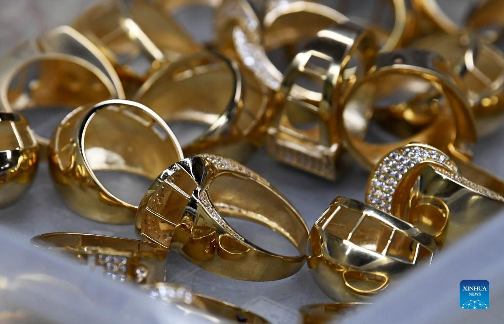 Gold rings are displayed in a shop in Kuyumcukent of Istanbul, Turkey, June 21, 2022. (Xinhua/Shadati)