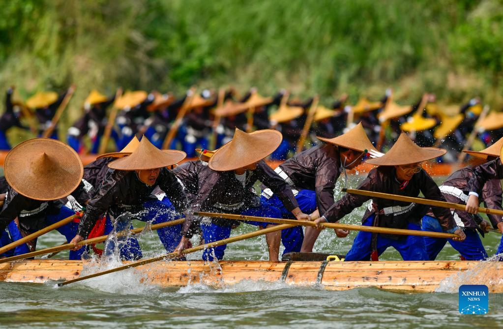 People of Miao ethic group take part in the canoe dragon boat festival in Shidong Town, Taijiang County of southwest China's Guizhou Province, June 23, 2022. The yearly canoe dragon boat festival of Miao ethnic group was held here on Thursday. (Xinhua/Yang Wenbin)