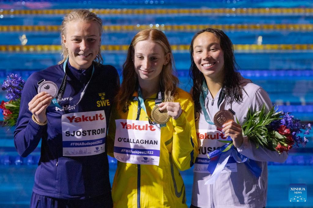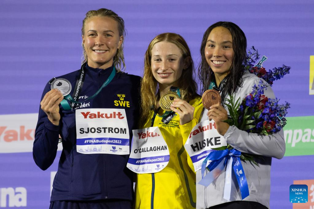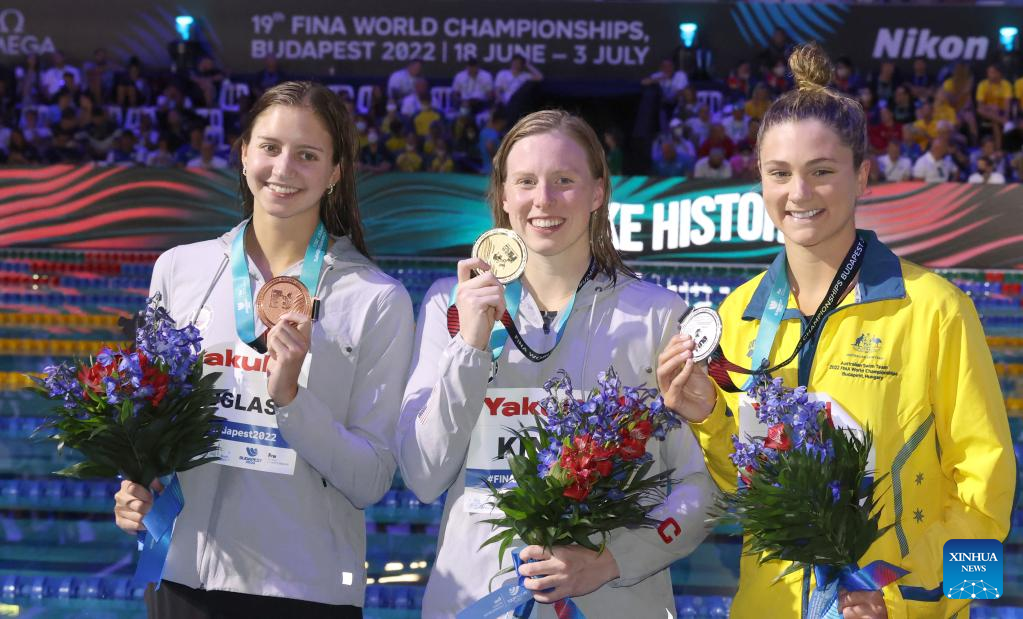 Silver medalist Sweden's Sarah Sjostrom (L), gold medalist Australia's Mollie O'Callaghan (C) and bronze medalist Torri Huske of the United States celebrate their victory during the awarding ceremony after the women's 100m freestyle final at the 19th FINA World Championships in Budapest, Hungary, June 23, 2022. (Photo by Attila Volgyi/Xinhua)