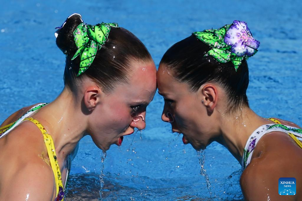 Maryna Aleksiiva and Vladyslava Aleksiiva of Ukraine perform during the Artistic Swimming Women Duet Free Final in Budapest, Hungary, June 23, 2022. (Xinhua/Zheng Huansong)