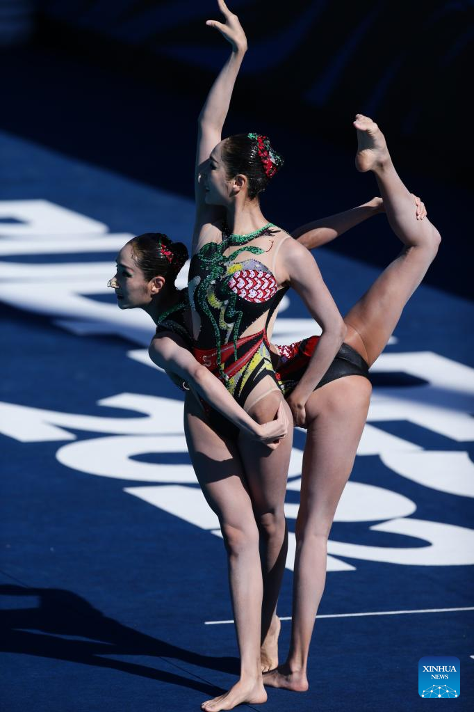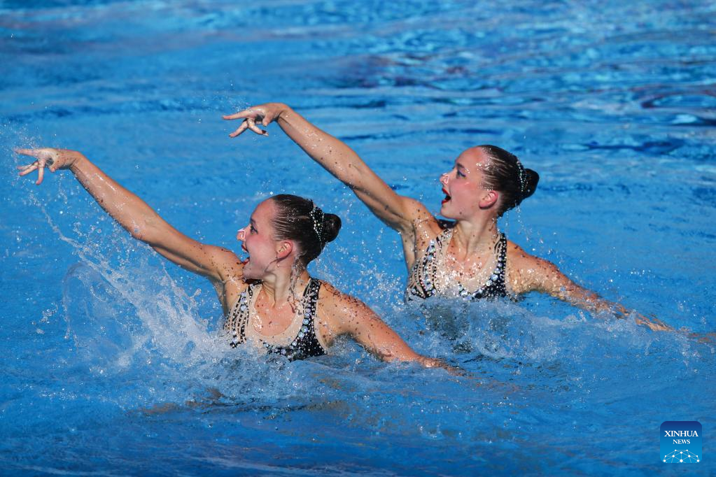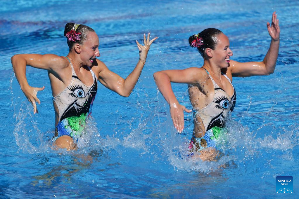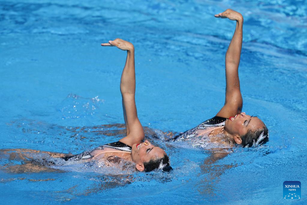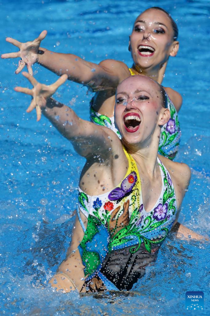 Alisa Ozhogina Ozhogin and Iris Tio Casas of Spain perform during the Artistic Swimming Women Duet Free Final in Budapest, Hungary, June 23, 2022. (Xinhua/Zheng Huansong)