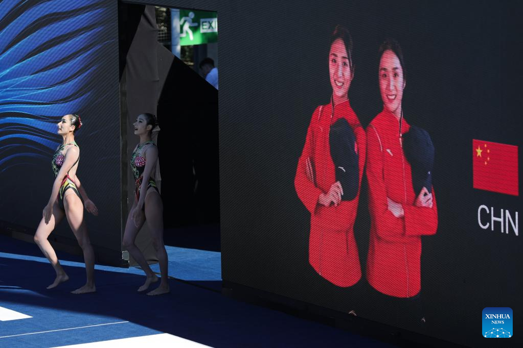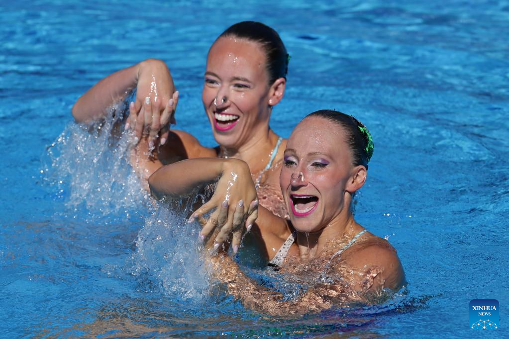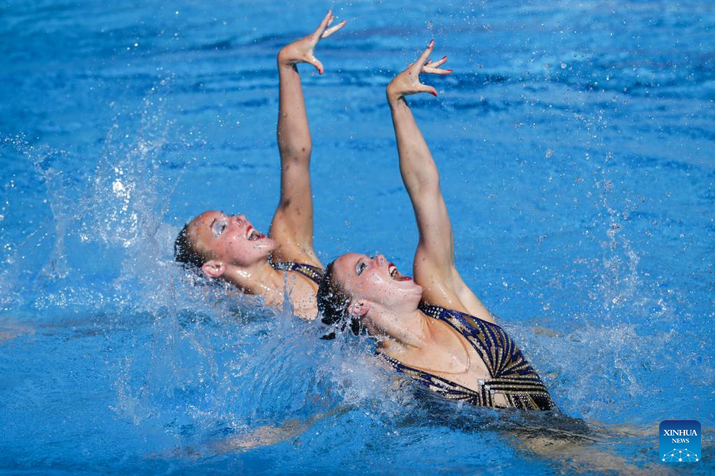 Megumi Field and Natalia Vega of the United States compete during the Artistic Swimming Women Duet Free Final in Budapest, Hungary, June 23, 2022. (Xinhua/Zheng Huansong)