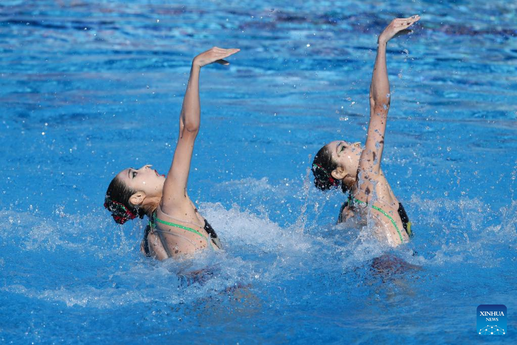 Nuria Diosdado Garcia and Joana Jimenez Garcia of Mexico perform during the Artistic Swimming Women Duet Free Final in Budapest, Hungary, June 23, 2022. (Xinhua/Zheng Huansong)