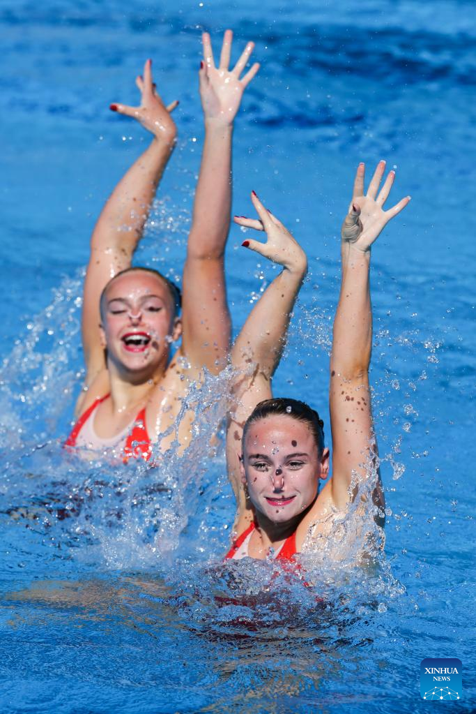 Kate Shortman and Isabelle Thorpe of Britain perform during the Artistic Swimming Women Duet Free Final in Budapest, Hungary, June 23, 2022. (Xinhua/Zheng Huansong)