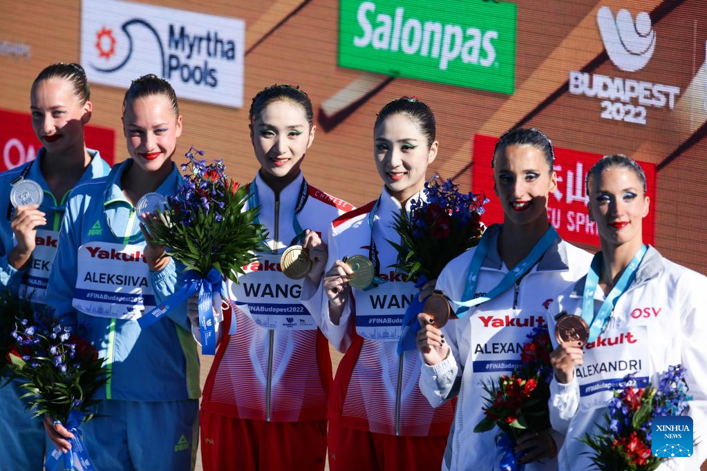 Wang Liuyi and Wang Qianyi of China compete during the Artistic Swimming Women Duet Free Final in Budapest, Hungary, June 23, 2022. (Xinhua/Zheng Huansong)