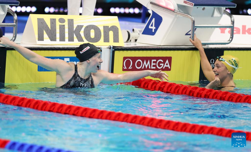 Lilly King (L) of the United States celebrates with Jenna Strauch of Australia after the women's 200m breaststroke final at the 19th FINA World Championships in Budapest, Hungary, June 23, 2022. (Xinhua/Li Ying)