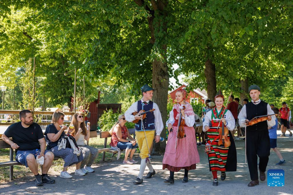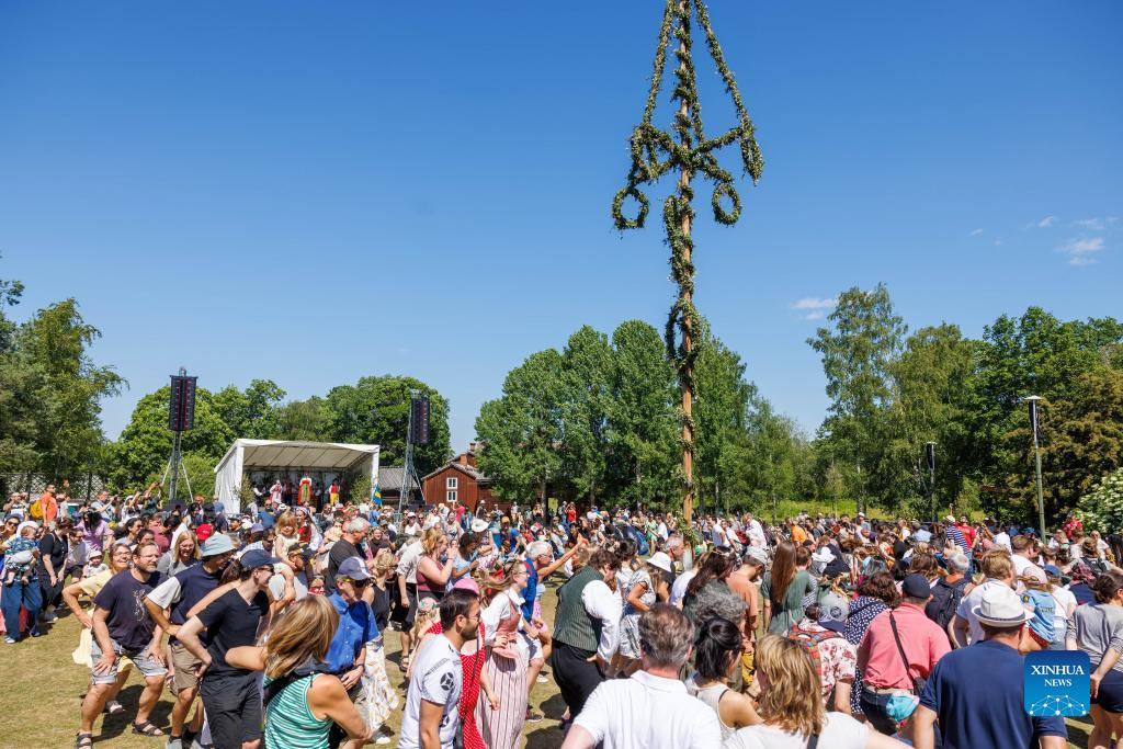 People celebrate the Midsummer Festival in Stockholm, Sweden, on June 25, 2022. (Photo by Wei Xuechao/Xinhua)