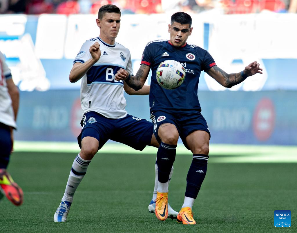 Vancouver Whitecaps' Lucas Cavallini (L) vies with New England Revolution's Andrew Farrell during the 2022 Major League Soccer (MLS) match at BC Place in Vancouver, Canada, June 26, 2022. (Photo by Andrew Soong/Xinhua)