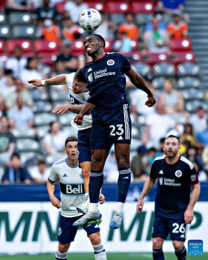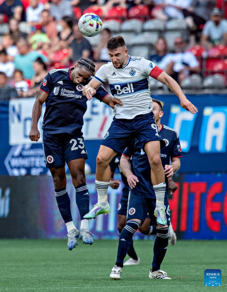 New England Revolution's Jonathan Bell (top R) vies for a header during the 2022 Major League Soccer (MLS) match between Vancouver Whitecaps and New England Revolution at BC Place in Vancouver, Canada, June 26, 2022. (Photo by Andrew Soong/Xinhua)