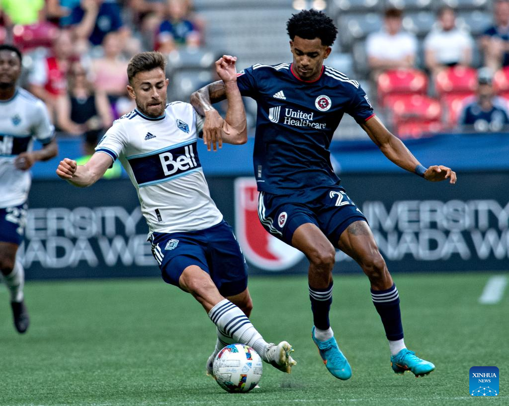 New England Revolution's Wilfrid Kaptoum (L) vies with Vancouver Whitecaps' Ryan Gauld during the 2022 Major League Soccer (MLS) match at BC Place in Vancouver, Canada, June 26, 2022. (Photo by Andrew Soong/Xinhua)