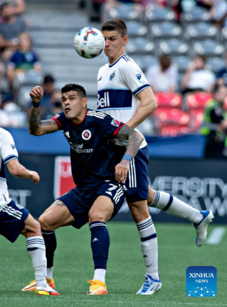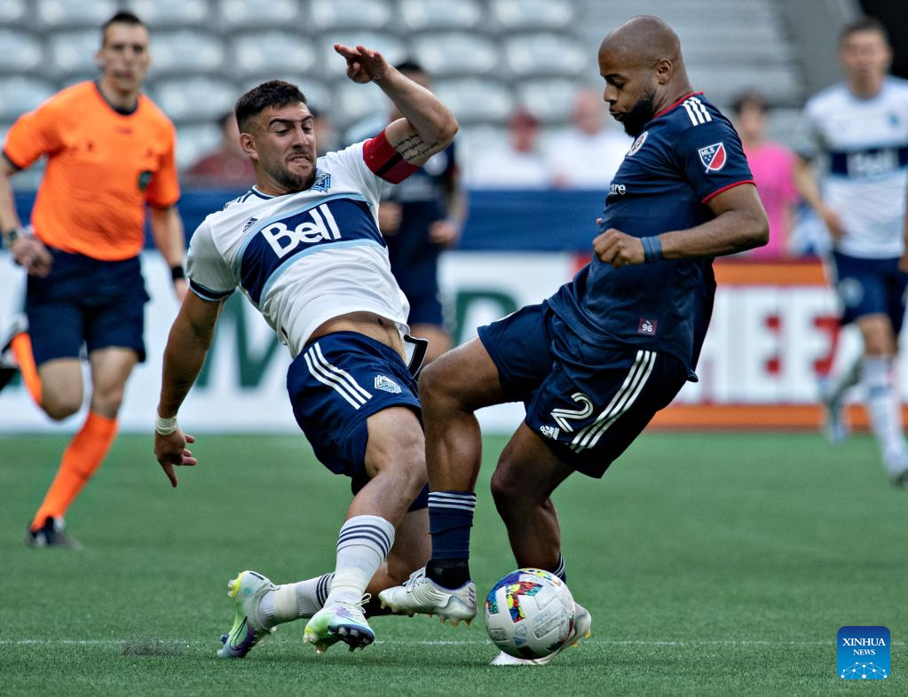 Vancouver Whitecaps' Ranko Veselinovic (L) vies with New England Revolution's Gustavo Bou during the 2022 Major League Soccer (MLS) match at BC Place in Vancouver, Canada, June 26, 2022. (Photo by Andrew Soong/Xinhua)