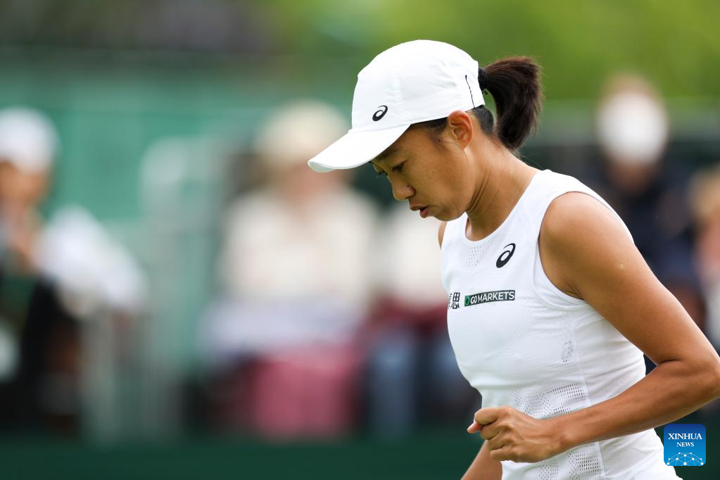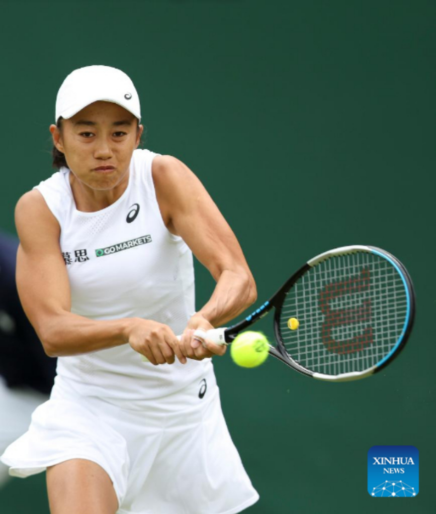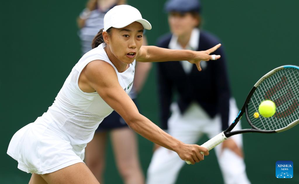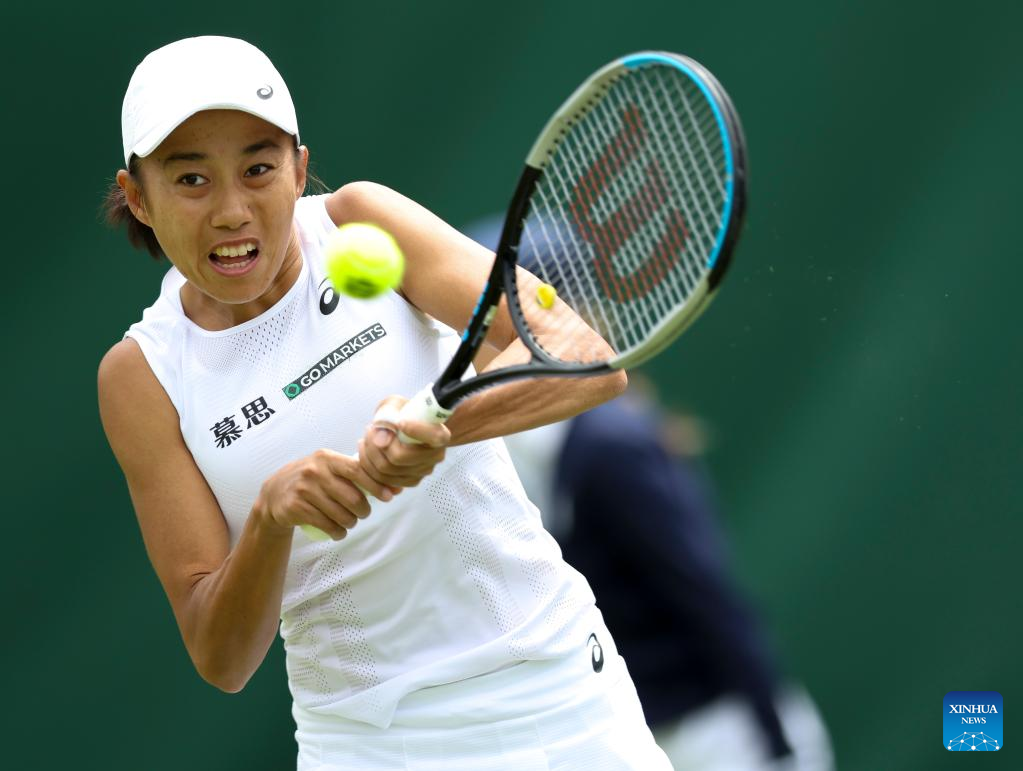 Zhang Shuai of China hits a return during the women's singles first round match against Doi Misaki of Japan at Wimbledon Tennis Championship in London, Britain, June 28, 2022. (Xinhua/Han Yan)