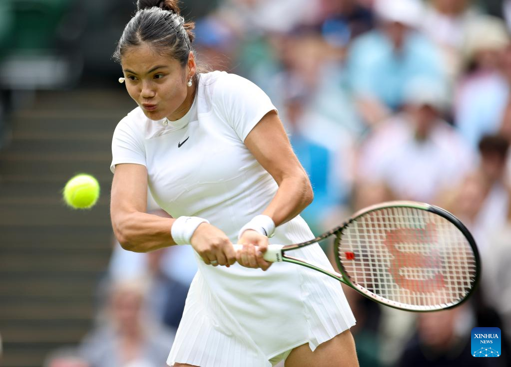 Emma Raducanu competes during the women's singles first round match between Emma Raducanu of Britain and Alison Van Uytvanck of Belgium at Wimbledon tennis championship in London, Britain, on June 27, 2022. (Xinhua/Han Yan)