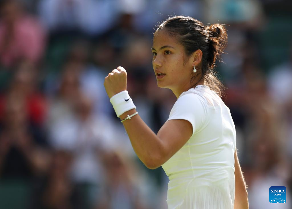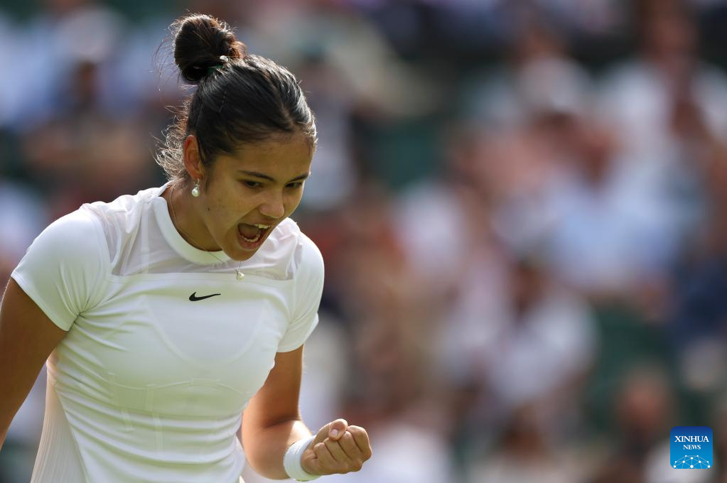 Emma Raducanu reacts during the women's singles first round match between Emma Raducanu of Britain and Alison Van Uytvanck of Belgium at Wimbledon tennis championship in London, Britain, on June 27, 2022. (Xinhua/Han Yan)