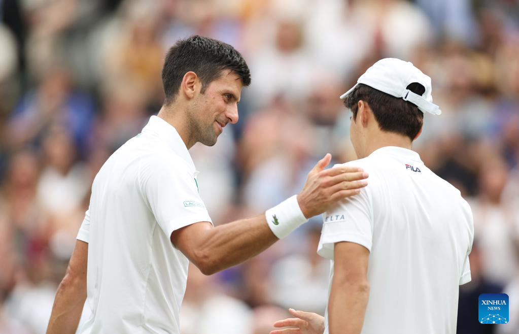Novak Djokovic (L) greets Kwon Soonwoo after the men's singles first round match between Novak Djokovic of Serbia and Kwon Soonwoo of South Korea at Wimbledon Tennis Championship in London, Britain, on June 27, 2022. (Xinhua/Li Ying)