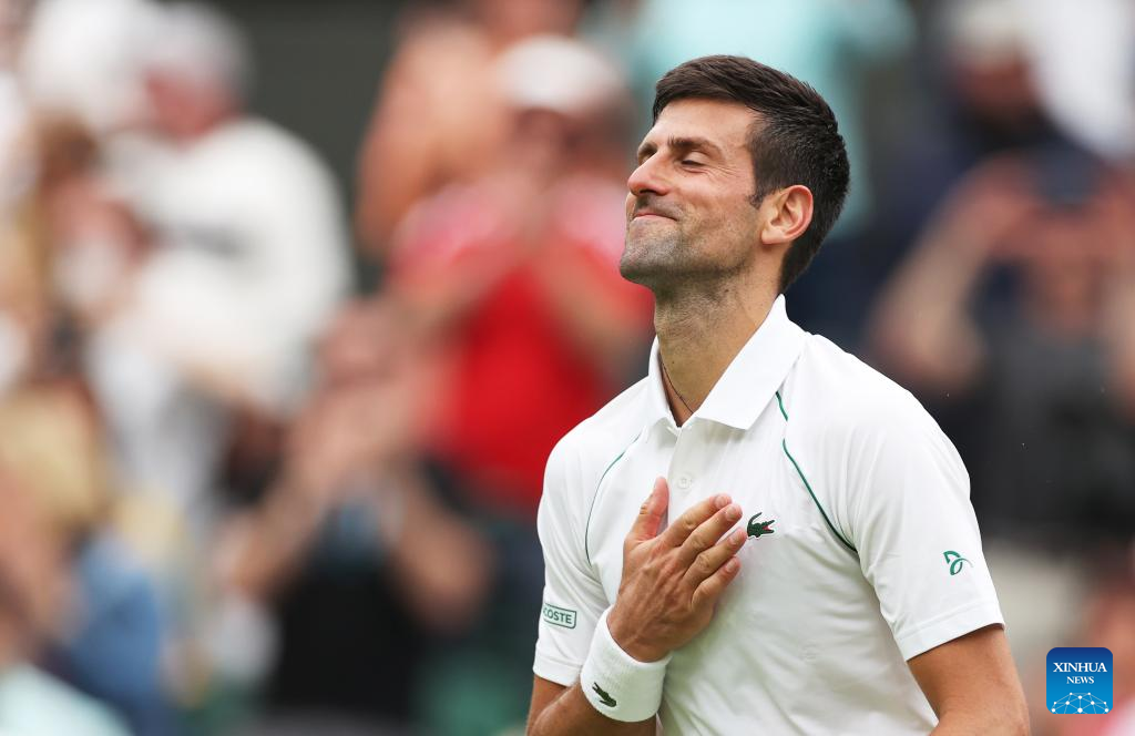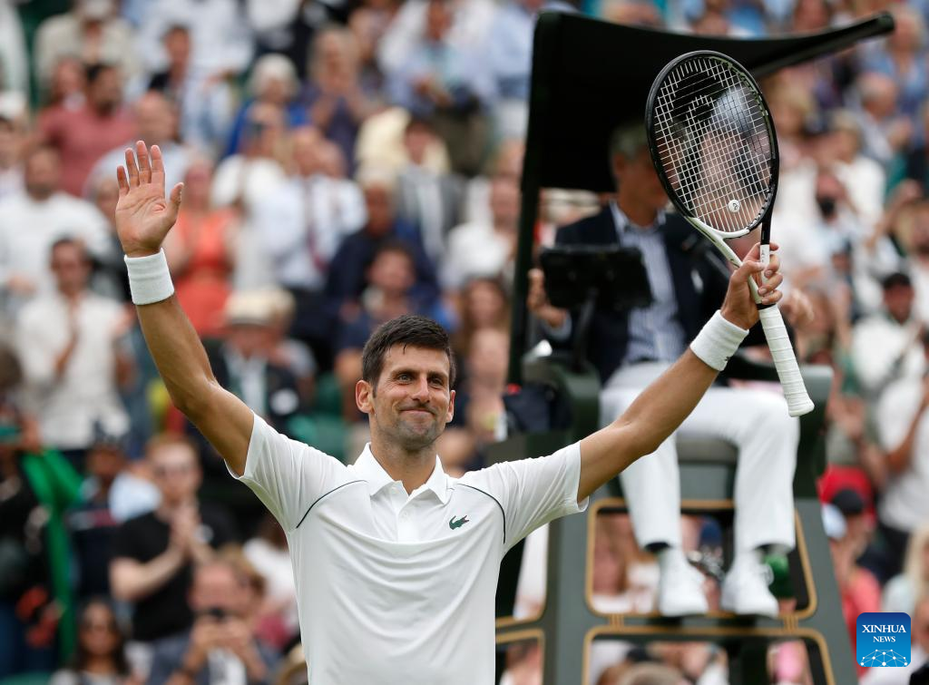 Novak Djokovic celebrates after winning the men's singles first round match between Novak Djokovic of Serbia and Kwon Soonwoo of South Korea at Wimbledon Tennis Championship in London, Britain, on June 27, 2022. (Xinhua/Li Ying)
