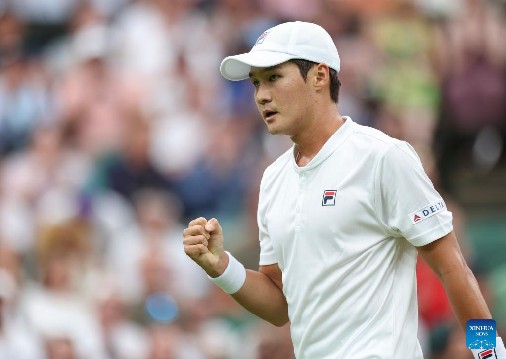 Kwon Soonwoo reacts during the men's singles first round match between Novak Djokovic of Serbia and Kwon Soonwoo of South Korea at Wimbledon Tennis Championship in London, Britain, on June 27, 2022. (Xinhua/Han Yan)