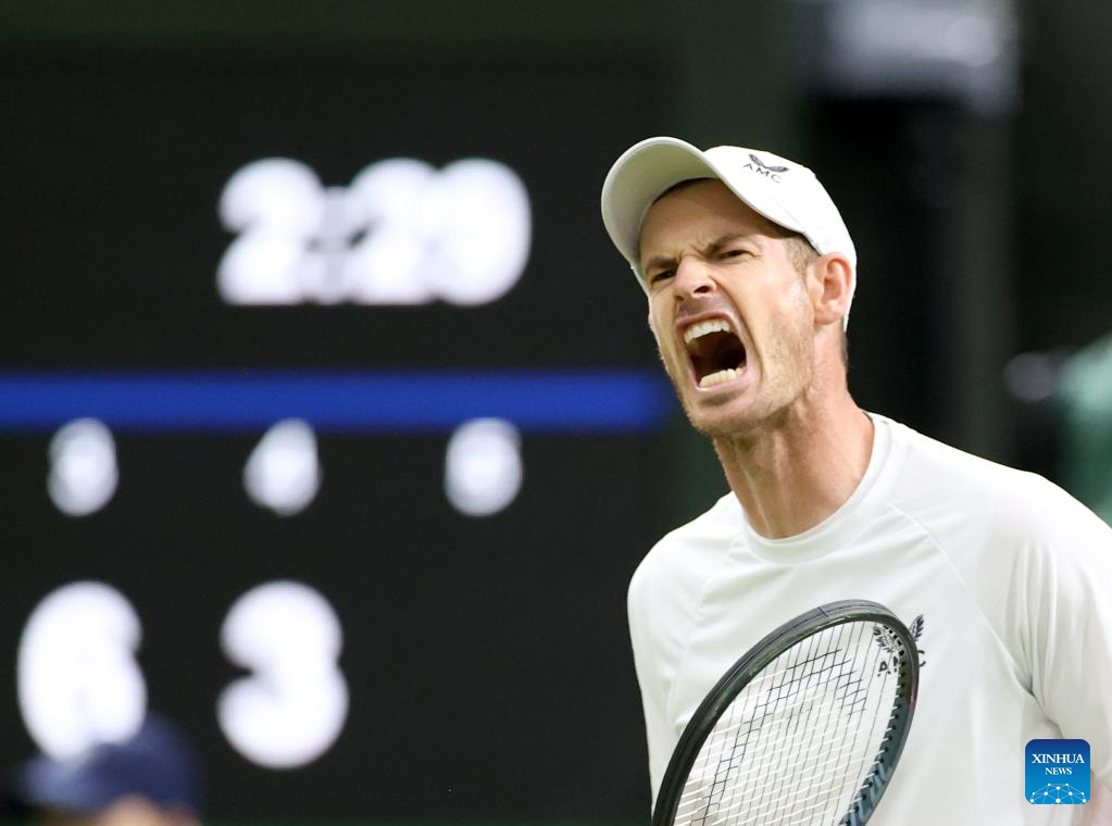 Andy Murray celebrates scoring during the men's singles first round match between Andy Murray of Britain and James Duckworth of Australia at Wimbledon Tennis Championship in London, Britain, on June 27, 2022. (Xinhua/Li Ying)