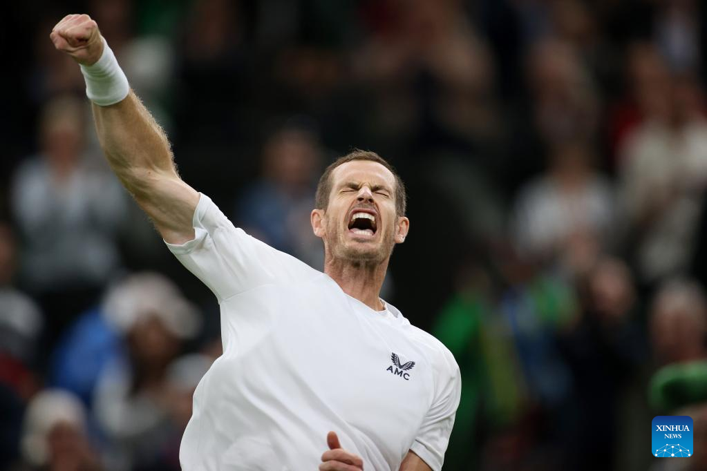 Andy Murray celebrates after winning the men's singles first round match between Andy Murray of Britain and James Duckworth of Australia at Wimbledon Tennis Championship in London, Britain, on June 27, 2022. (Xinhua/Li Ying)