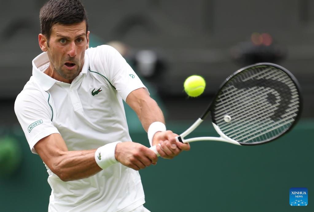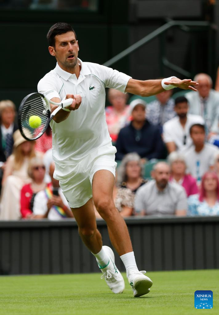 Novak Djokovic hits a return during the men's singles first round match between Novak Djokovic of Serbia and Kwon Soonwoo of South Korea at Wimbledon Tennis Championship in London, Britain, on June 27, 2022. (Xinhua/Han Yan)