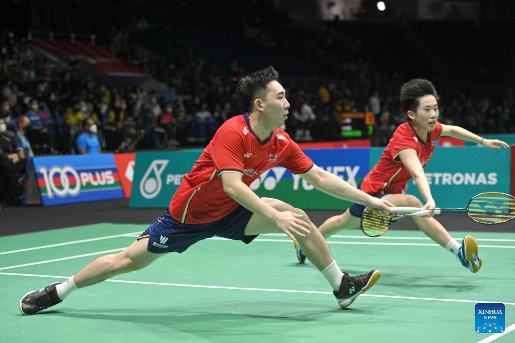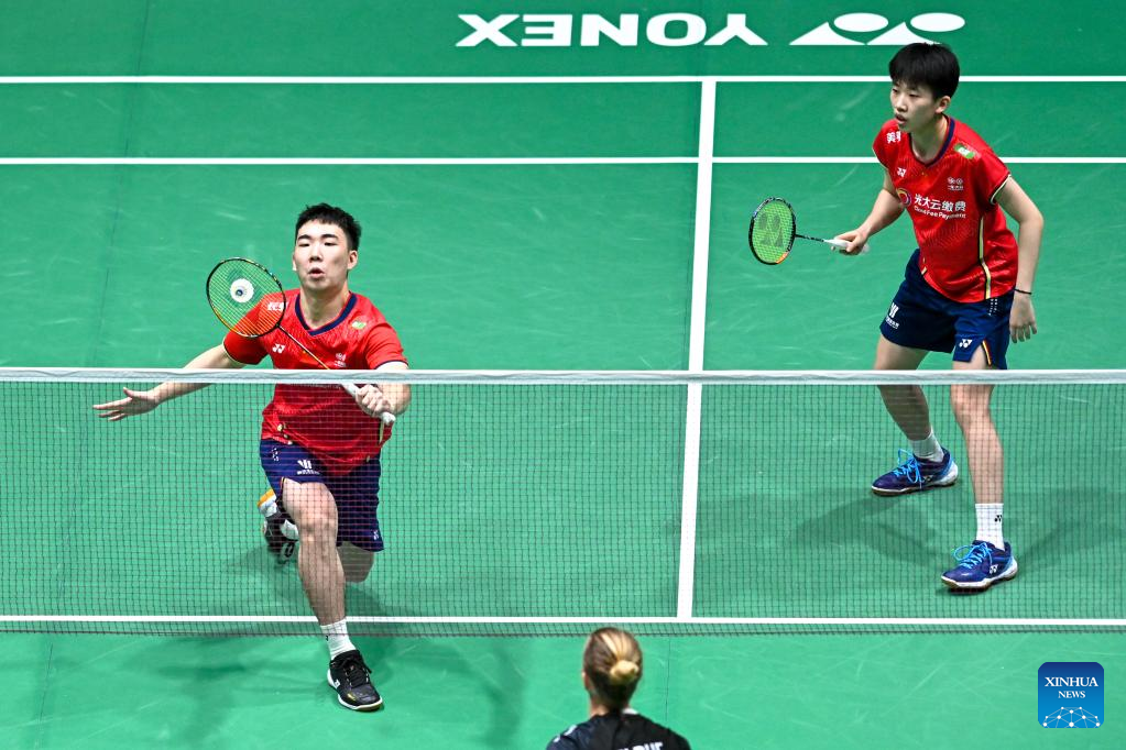 Guo Xinwa/Zhang Shuxian (R) compete during the mixed doubles round of 32 match between Guo Xinwa/Zhang Shuxian of China and Thom Gicquel/Delphine Delrue of France at Malaysia Open 2022 in Kuala Lumpur, Malaysia, June 29, 2022. (Xinhua/Zhu Wei)