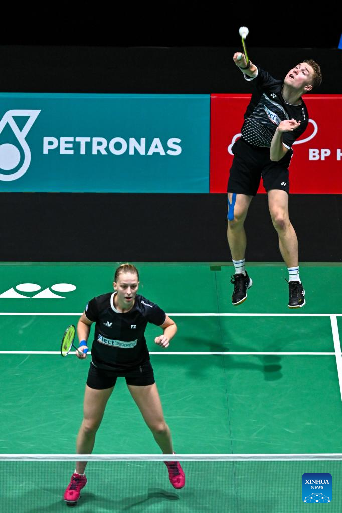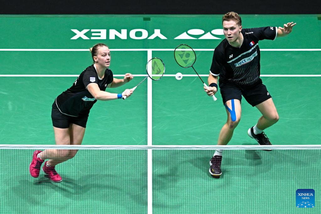 Thom Gicquel/Delphine Delrue (L) compete during the mixed doubles round of 32 match between Guo Xinwa/Zhang Shuxian of China and Thom Gicquel/Delphine Delrue of France at Malaysia Open 2022 in Kuala Lumpur, Malaysia, June 29, 2022. (Xinhua/Zhu Wei)