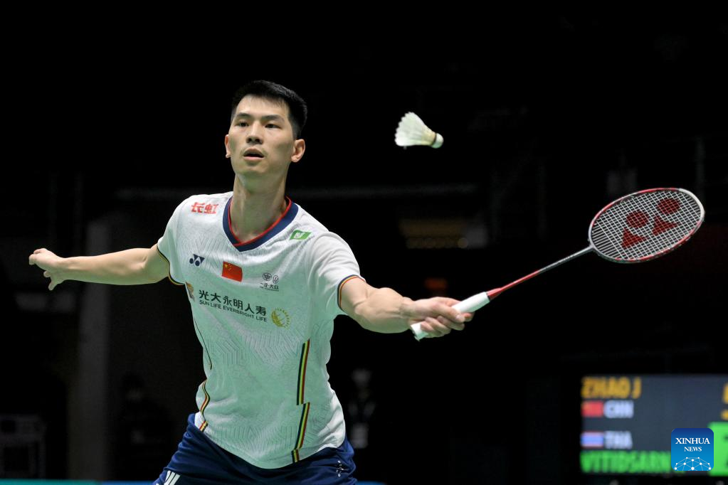 Zhao Junpeng hits a return during the men's singles round of 32 match between Zhao Junpeng of China and Kunlavut Vitidsarn of Thailand at Malaysia Open 2022 in Kuala Lumpur, Malaysia, June 29, 2022. (Photo by Chong Voon Chung/Xinhua)