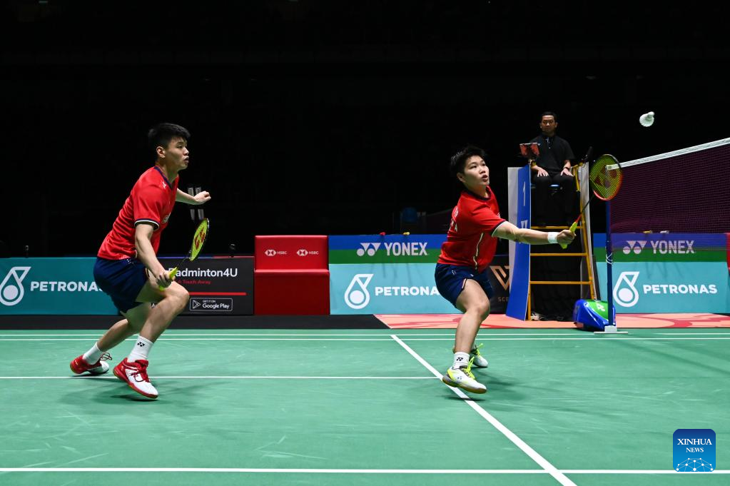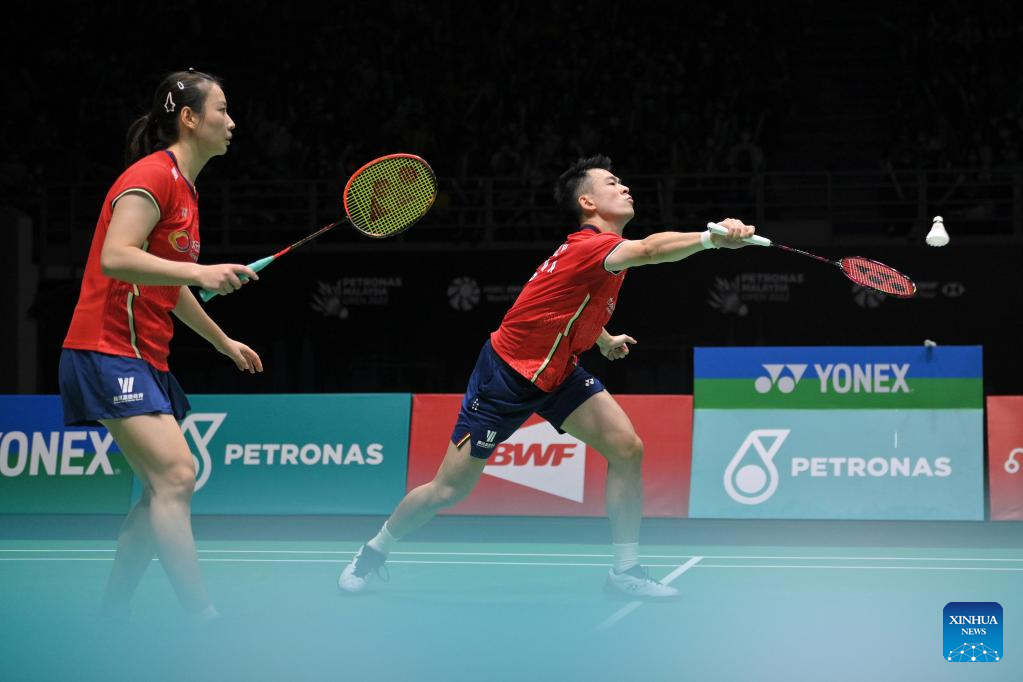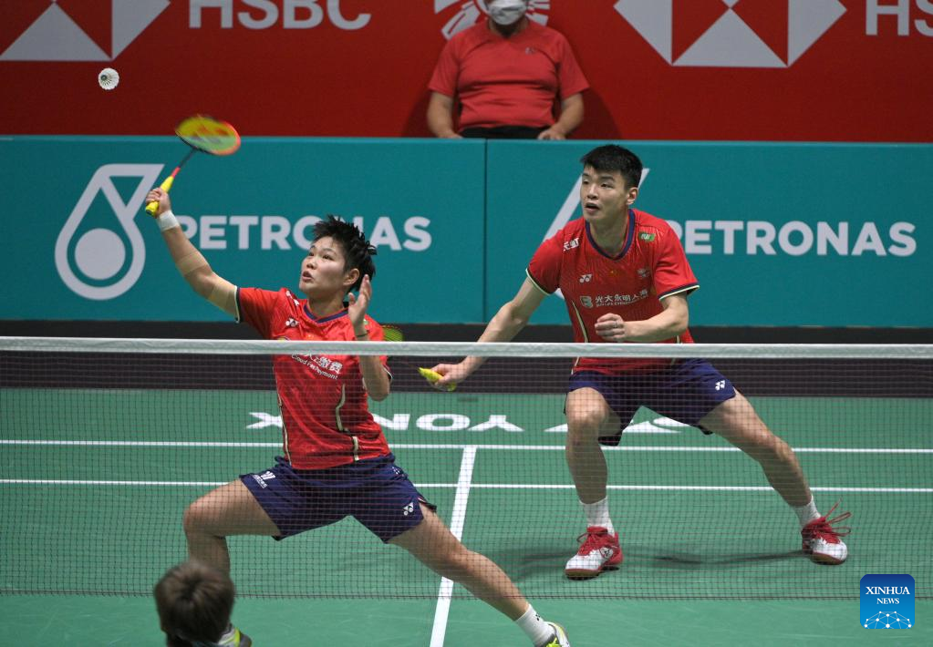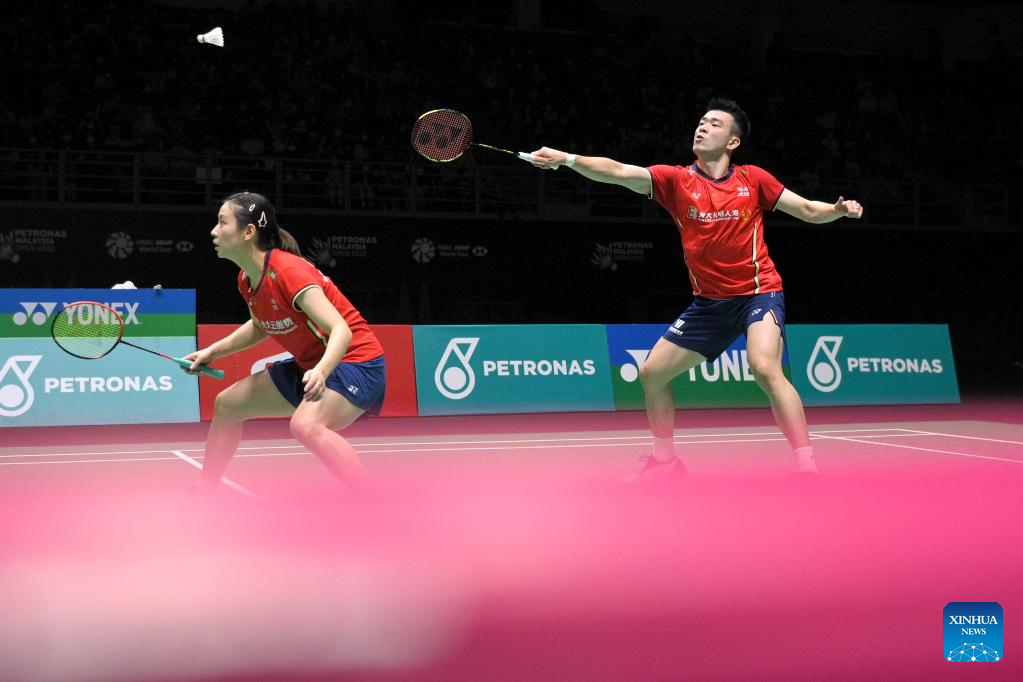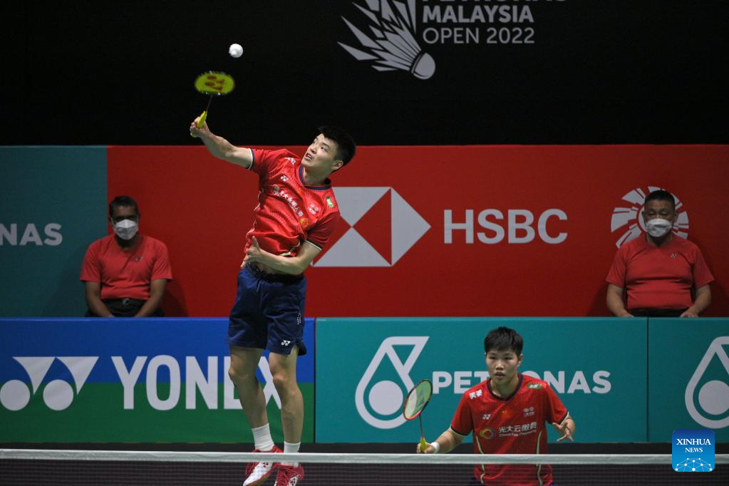 Wang Yilyu (R)/Huang Dongping compete during the mixed doubles semifinal match between Wang Yilyu/Huang Dongping of China and Dechapol Puavaranukroh/Sapsiree Taerattanachai of Thailand at Malaysia Open 2022 badminton tournament in Kuala Lumpur, Malaysia, July 2, 2022. (Xinhua/Zhu Wei)