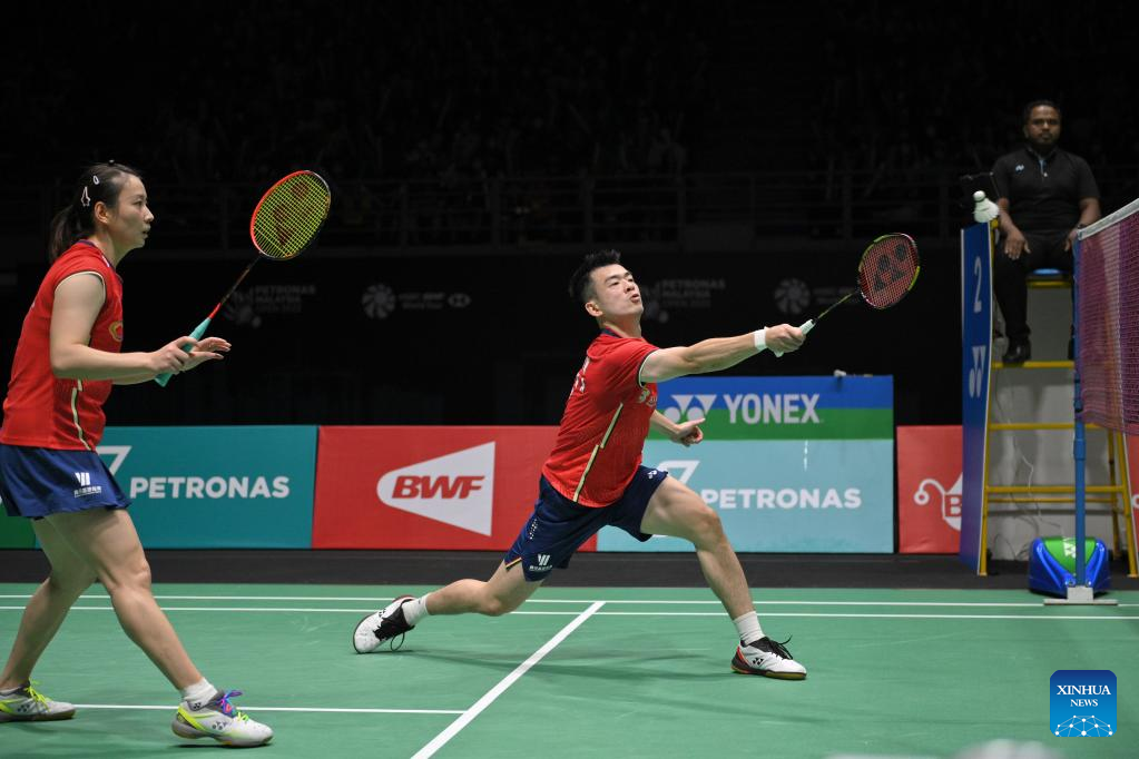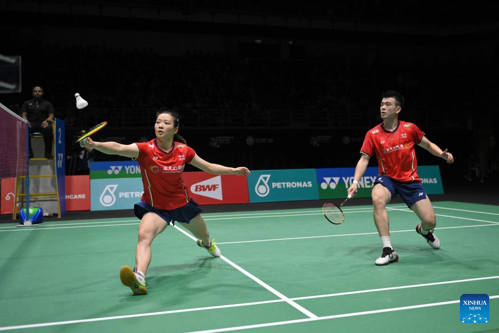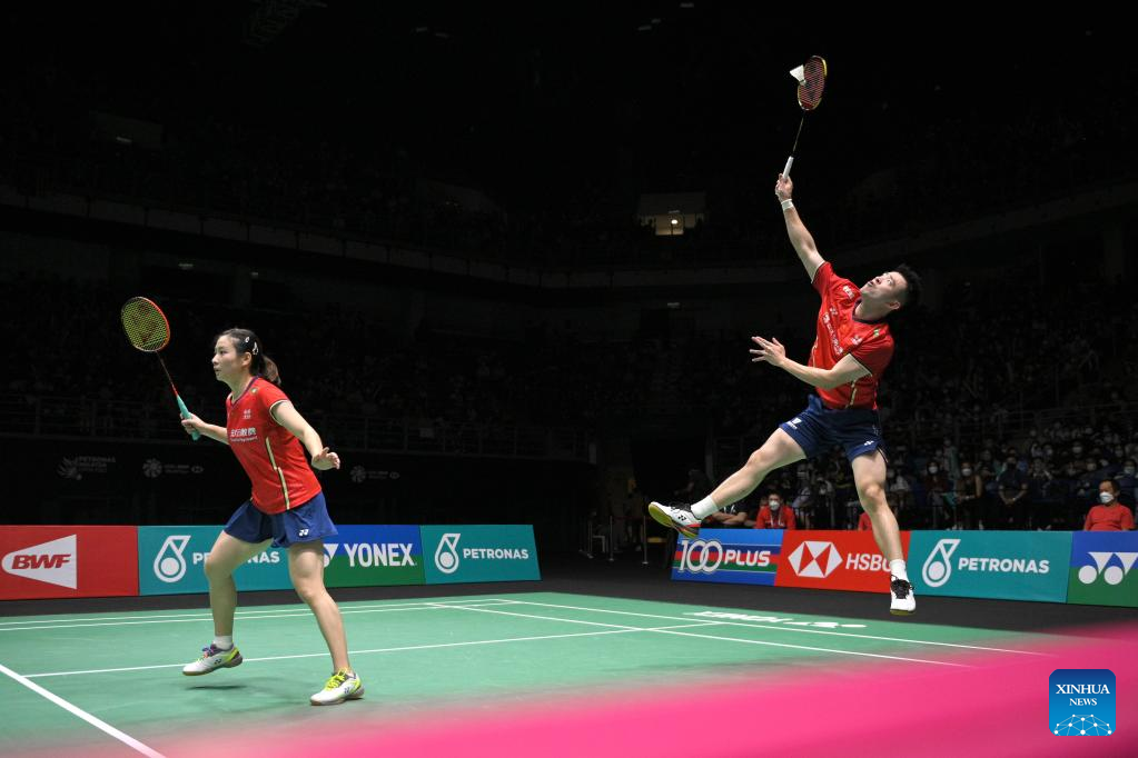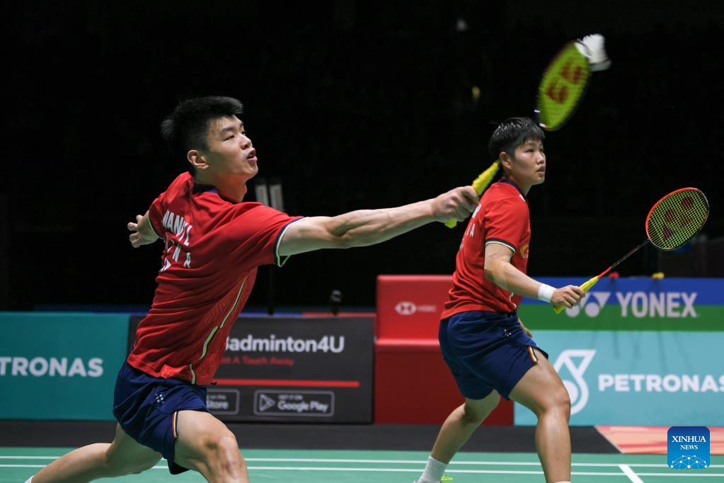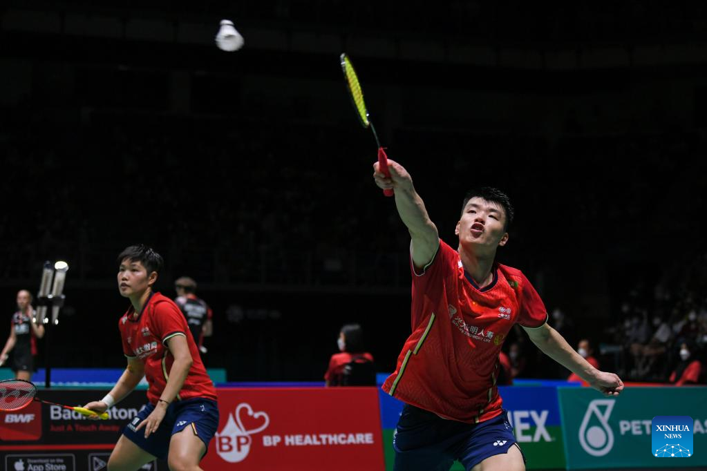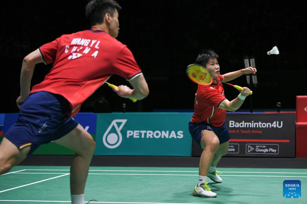 Wang Yilyu (R)/Huang Dongping compete during the mixed doubles semifinal match between Wang Yilyu/Huang Dongping of China and Dechapol Puavaranukroh/Sapsiree Taerattanachai of Thailand at Malaysia Open 2022 badminton tournament in Kuala Lumpur, Malaysia, July 2, 2022. (Xinhua/Zhu Wei)