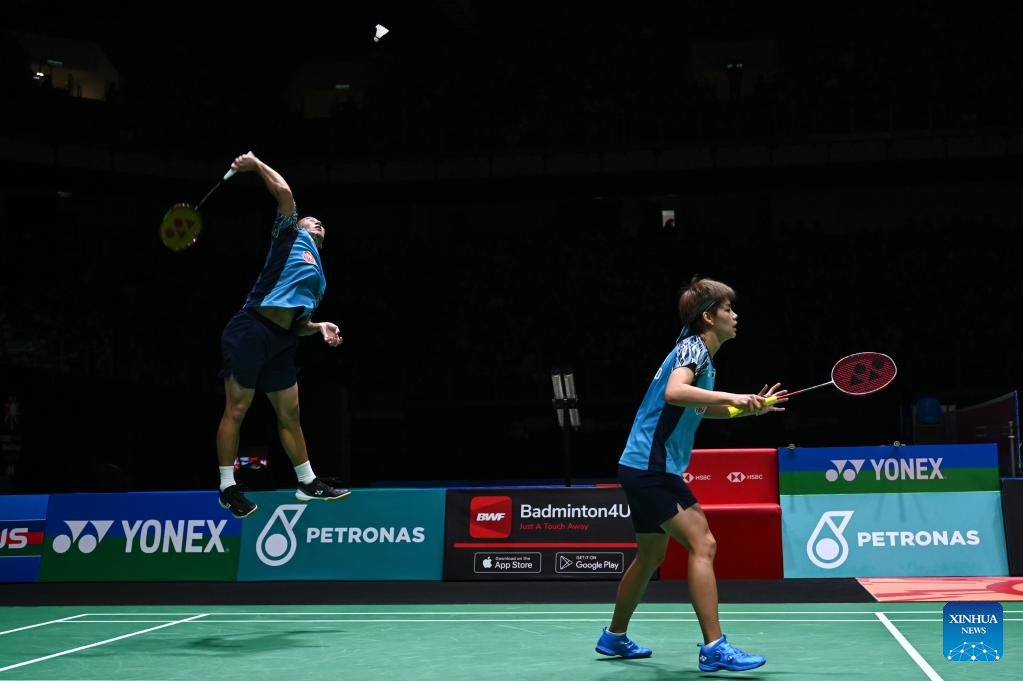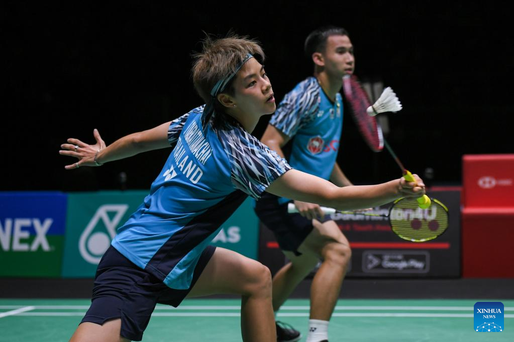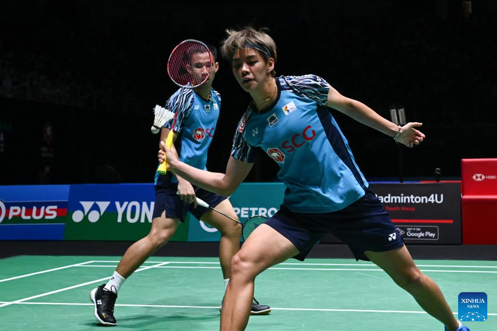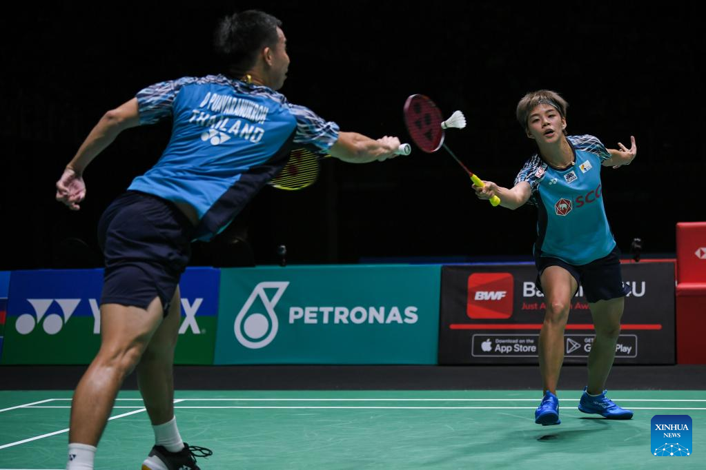 Dechapol Puavaranukroh /Sapsiree Taerattanachai (L) compete during the mixed doubles semifinal match between Wang Yilyu/Huang Dongping of China and Dechapol Puavaranukroh/Sapsiree Taerattanachai of Thailand at Malaysia Open 2022 badminton tournament in Kuala Lumpur, Malaysia, July 2, 2022. (Xinhua/Zhu Wei)