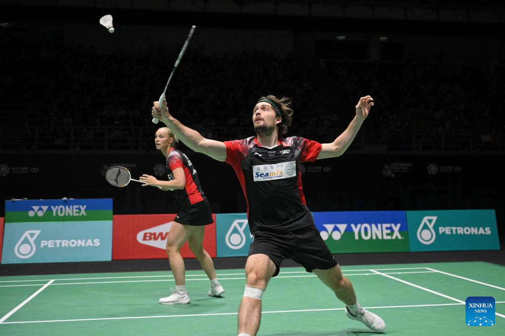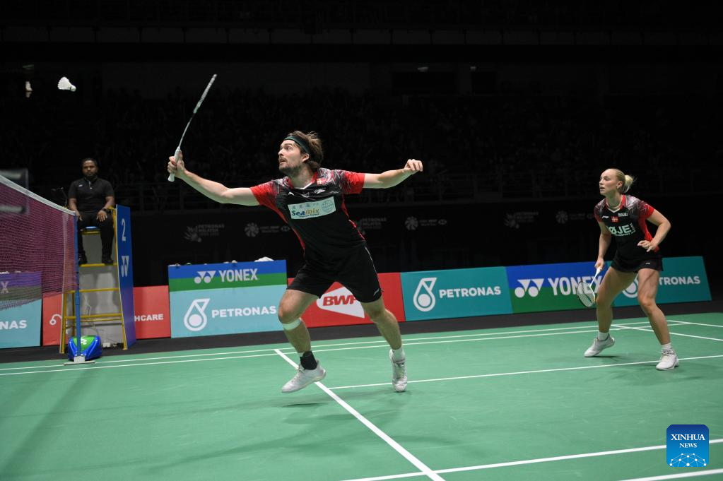 Mathias Christiansen (R)/Alexandra Boje compete during the mixed doubles semifinal match between Zheng Siwei/Huang Yaqiong of China and Mathias Christiansen/Alexandra Boje of Denmark at Malaysia Open 2022 badminton tournament in Kuala Lumpur, Malaysia, July 2, 2022. (Photo by Chong Voon Chung/Xinhua)
