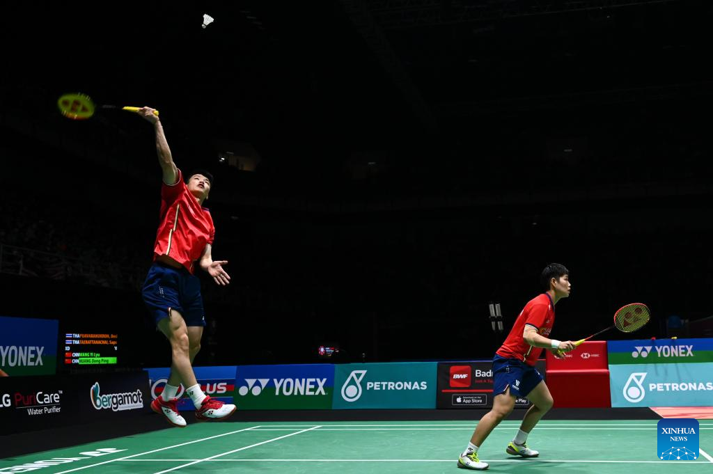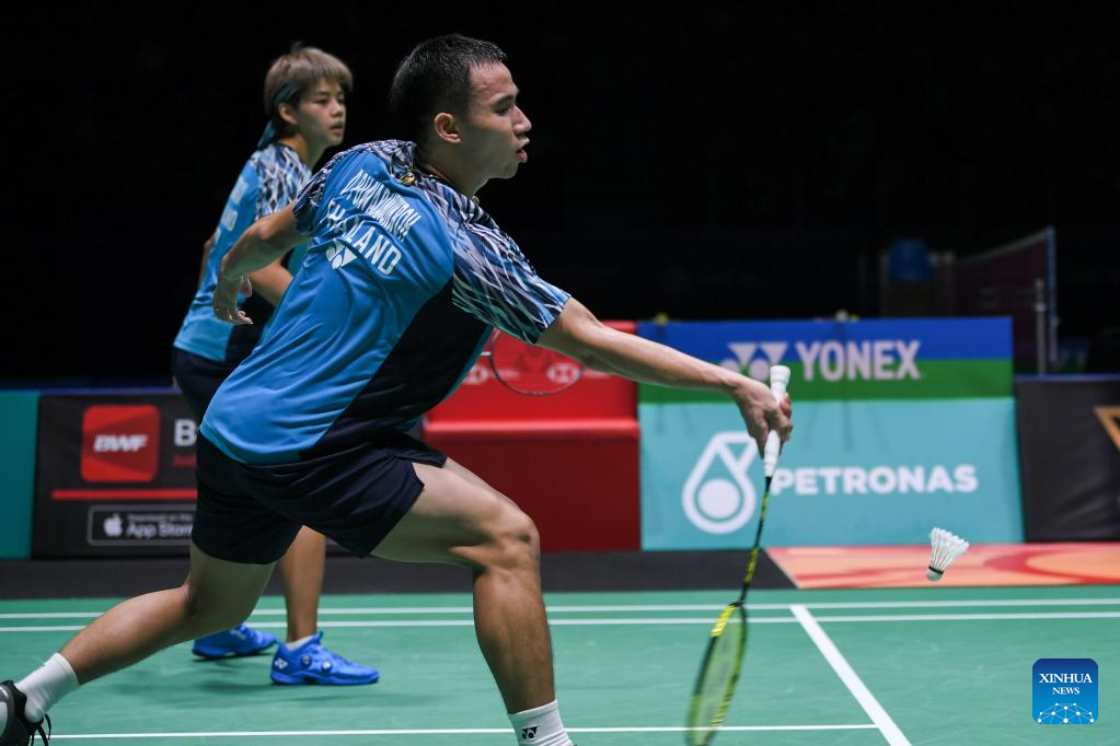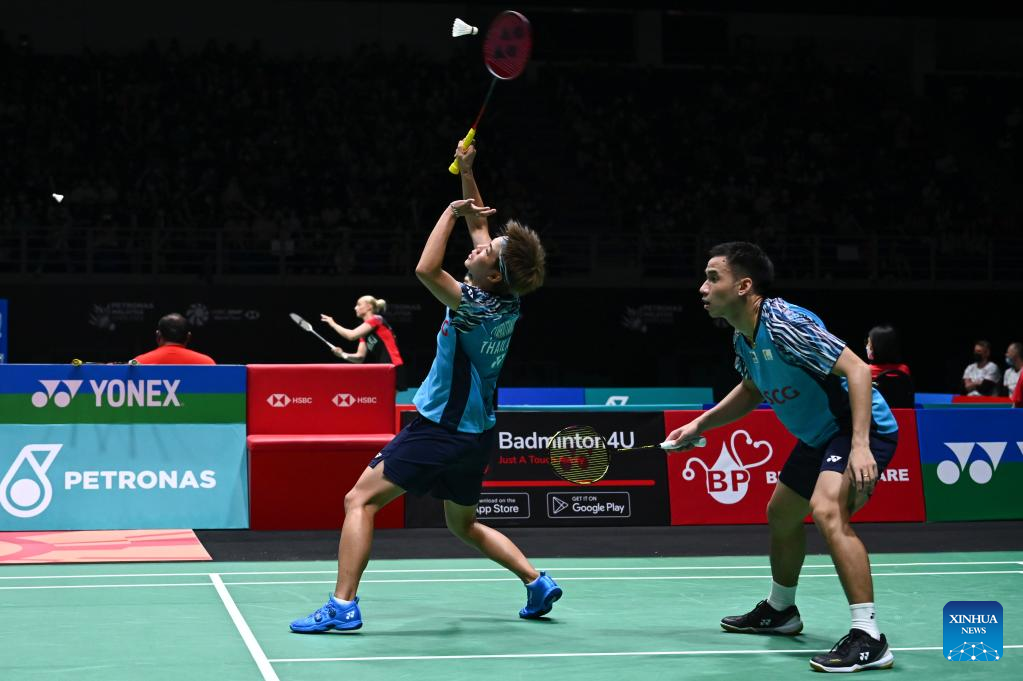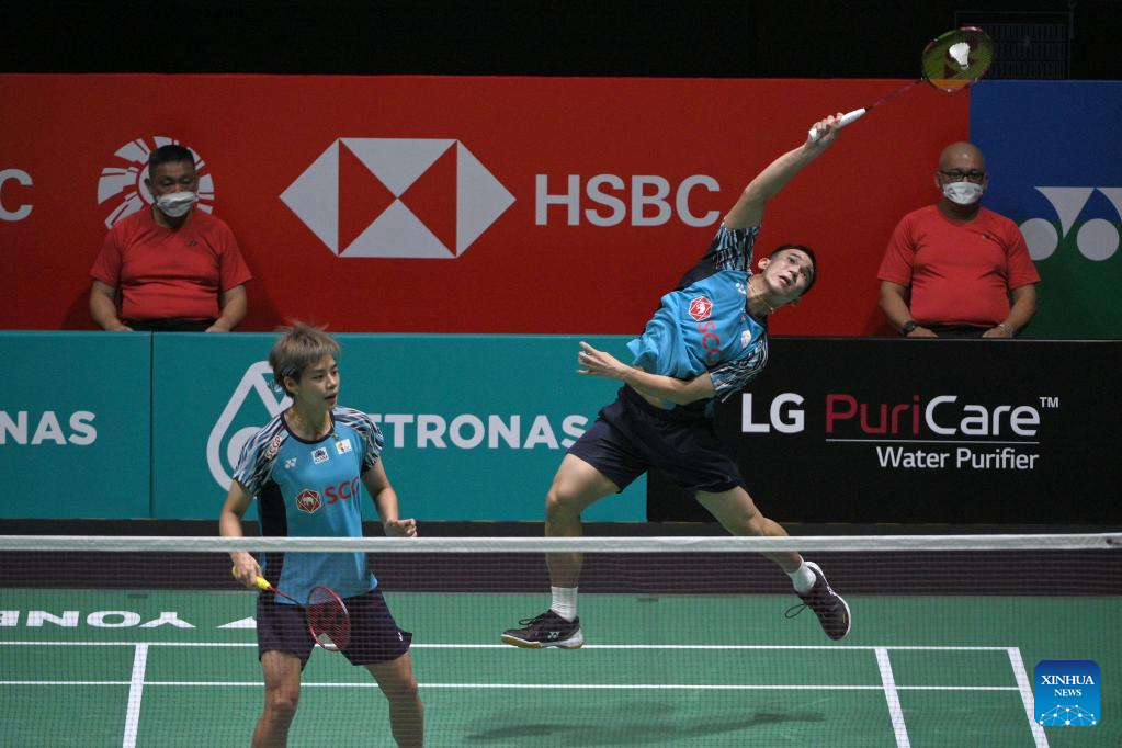 Dechapol Puavaranukroh (L)/Sapsiree Taerattanachai compete during the mixed doubles semifinal match between Wang Yilyu/Huang Dongping of China and Dechapol Puavaranukroh/Sapsiree Taerattanachai of Thailand at Malaysia Open 2022 badminton tournament in Kuala Lumpur, Malaysia, July 2, 2022. (Xinhua/Zhu Wei)