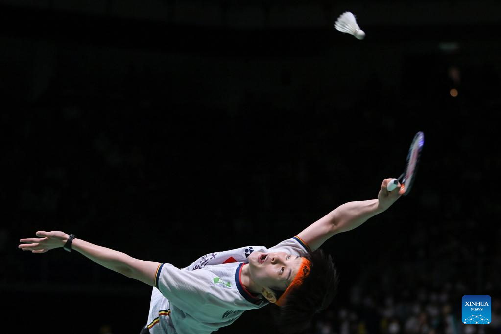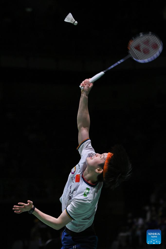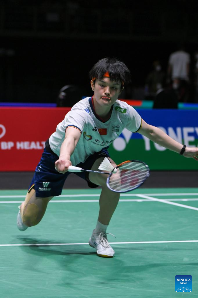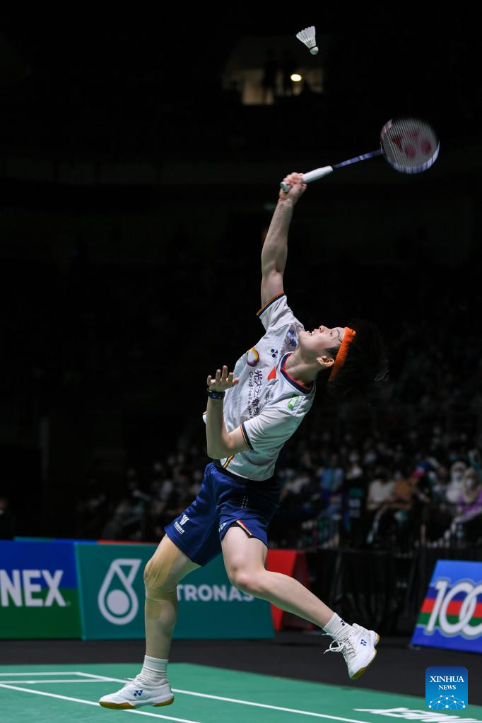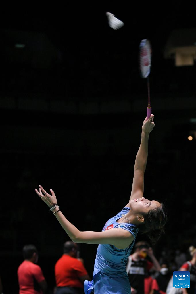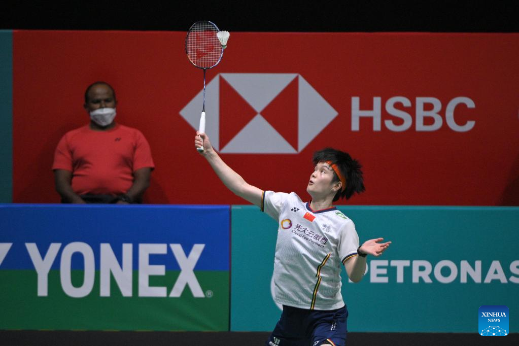 Wang Zhiyi returns the shuttlecock during the women's singles semifinal match between Wang Zhiyi of China and Ratchanok Intanon of Thailand at Malaysia Open 2022 badminton tournament in Kuala Lumpur, Malaysia, July 2, 2022. (Photo by Chong Voon Chung/Xinhua)