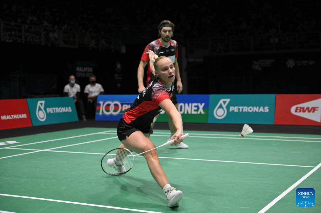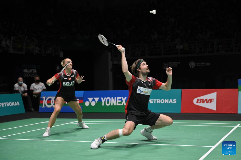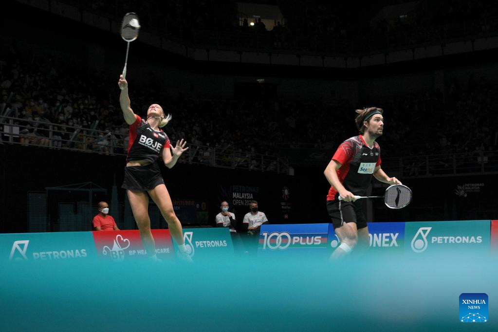 Mathias Christiansen/Alexandra Boje (front) compete during the mixed doubles semifinal match between Zheng Siwei/Huang Yaqiong of China and Mathias Christiansen/Alexandra Boje of Denmark at Malaysia Open 2022 badminton tournament in Kuala Lumpur, Malaysia, July 2, 2022. (Photo by Chong Voon Chung/Xinhua)