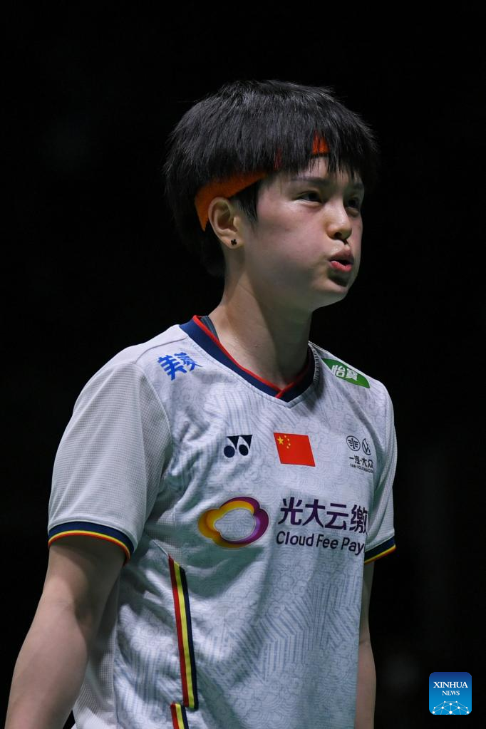 Wang Zhiyi reacts during the women's singles semifinal match between Wang Zhiyi of China and Ratchanok Intanon of Thailand at Malaysia Open 2022 badminton tournament in Kuala Lumpur, Malaysia, July 2, 2022. (Xinhua/Zhu Wei)