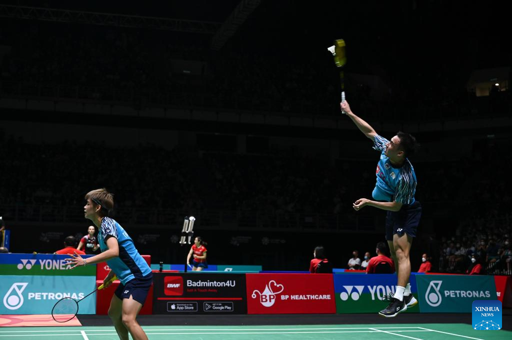 Dechapol Puavaranukroh (R)/Sapsiree Taerattanachai compete during the mixed doubles semifinal match between Wang Yilyu/Huang Dongping of China and Dechapol Puavaranukroh/Sapsiree Taerattanachai of Thailand at Malaysia Open 2022 badminton tournament in Kuala Lumpur, Malaysia, July 2, 2022. (Xinhua/Zhu Wei)