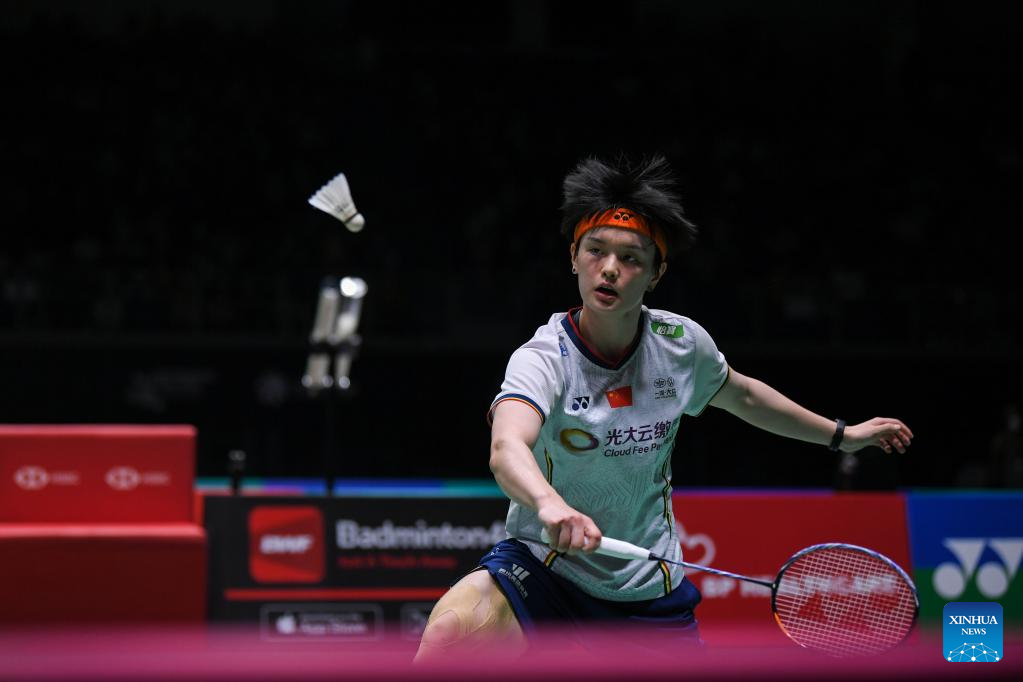 Wang Zhiyi returns the shuttlecock during the women's singles semifinal match between Wang Zhiyi of China and Ratchanok Intanon of Thailand at Malaysia Open 2022 badminton tournament in Kuala Lumpur, Malaysia, July 2, 2022. (Xinhua/Zhu Wei)