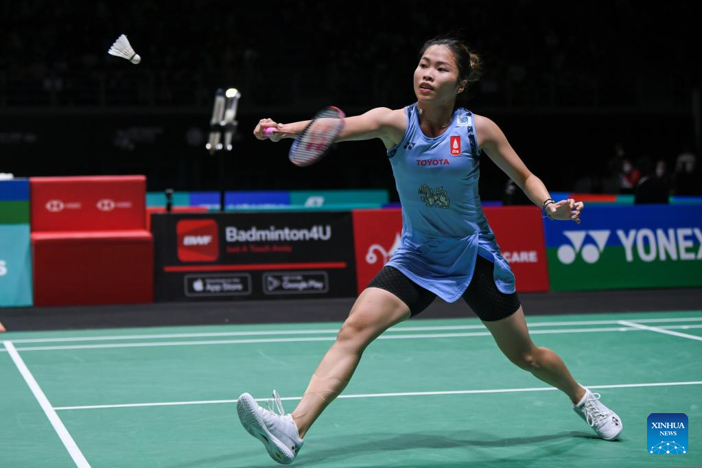Ratchanok Intanon returns the shuttlecock during the women's singles semifinal match between Wang Zhiyi of China and Ratchanok Intanon of Thailand at Malaysia Open 2022 badminton tournament in Kuala Lumpur, Malaysia, July 2, 2022. (Xinhua/Zhu Wei)